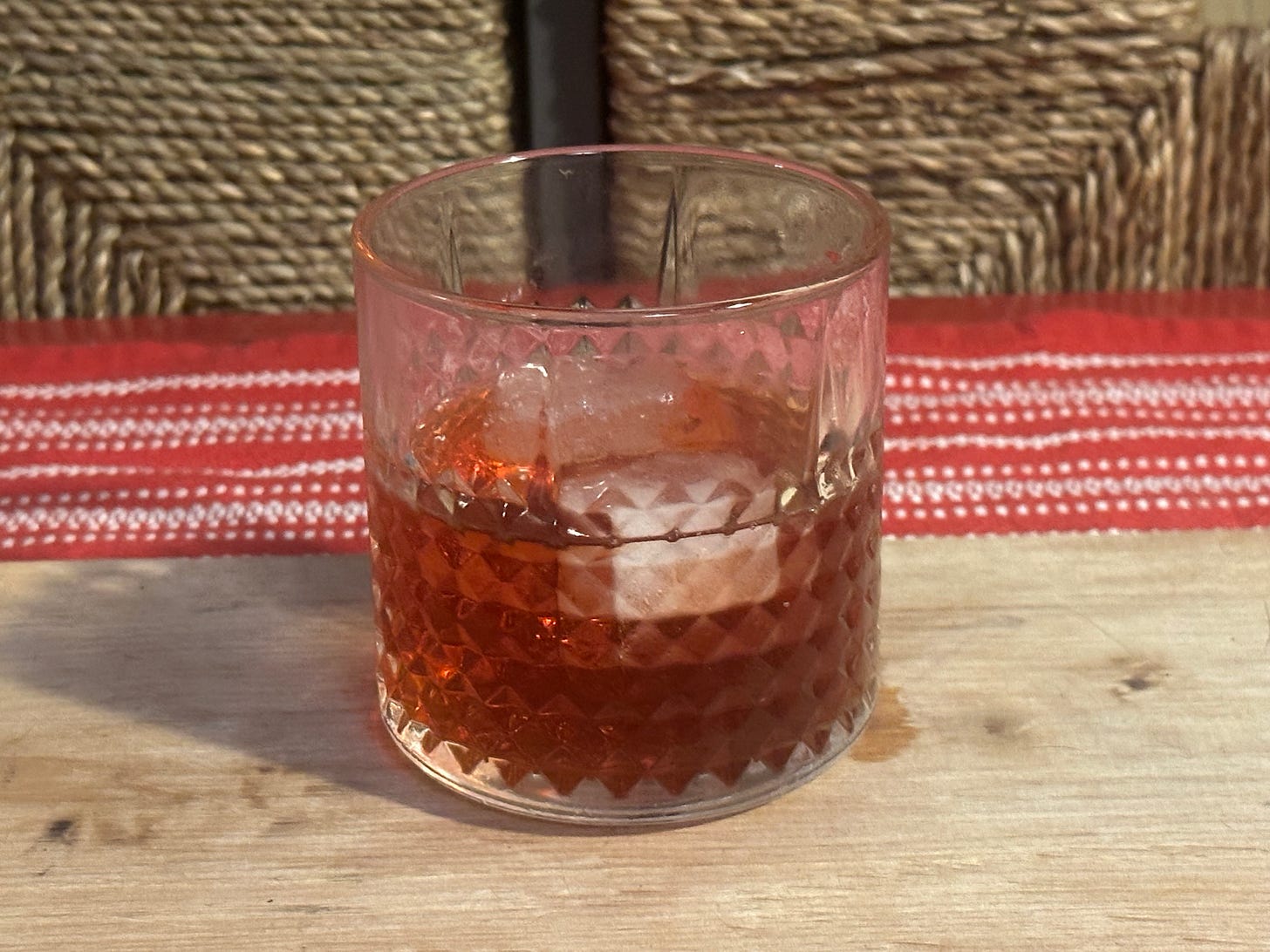 Combine all ingredients in a cocktail vessel with ice. Stir until the outside of the vessel feels cold. Pour into a double old fashioned glass. Add a large ice cube and serve at once.