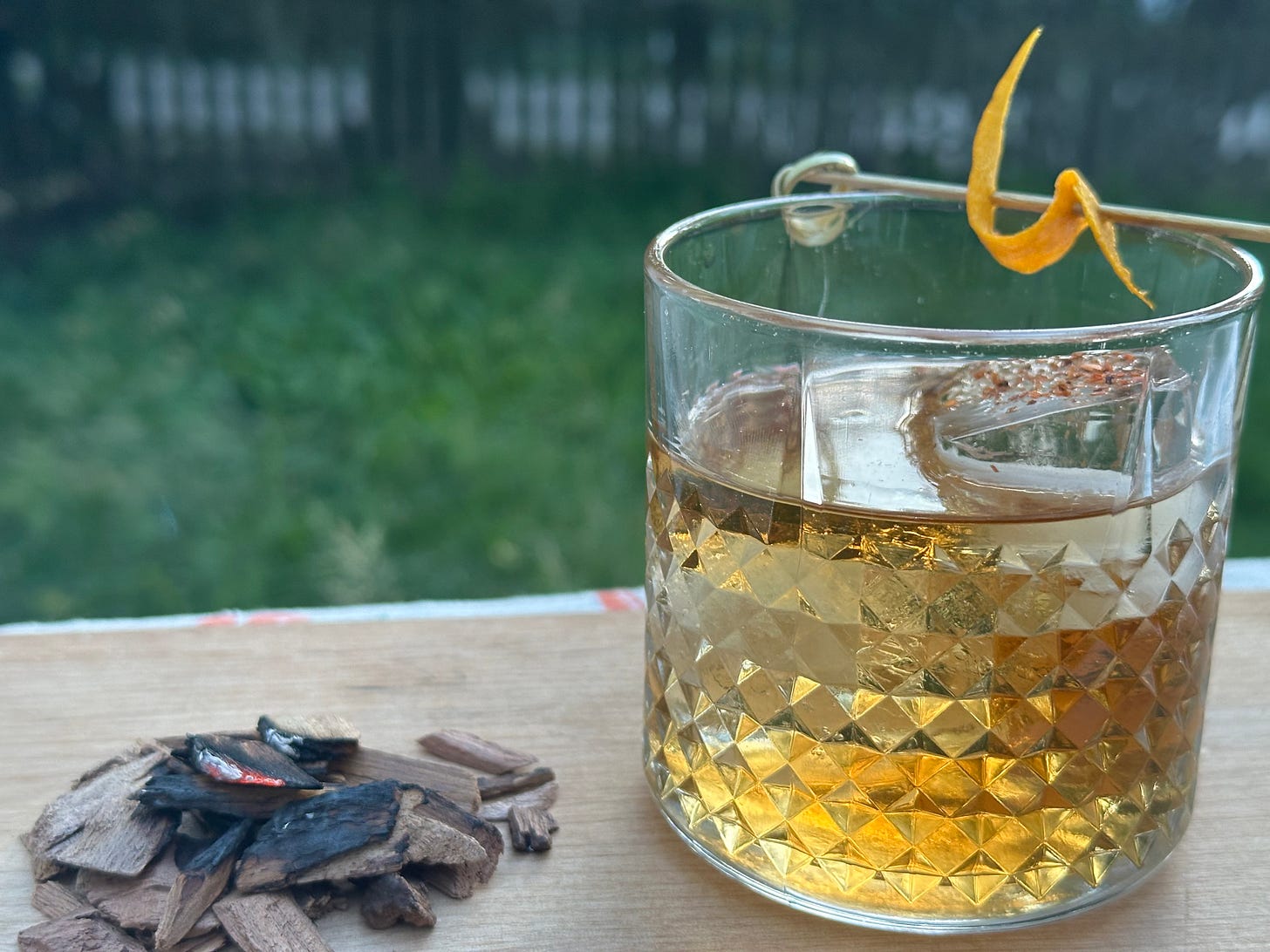 Mesquite Chips: Take a small pile of mesquite chips and light them on fire. I find that a cheap cigar lighter does the trick best. The chips burn very readily; when there’s a nice fire going, cover it with an upended glass. The smothered flames will cover the inside of the glass with smoke residue. That thin layer of ash is what we’re trying to harvest from the mesquite. Mix up the cocktail in the smoky glass; stir it well, and then pour the whole thing into a clean glass to serve the drink. Sip and savor. Let's enjoy the summertime evenings while we can.