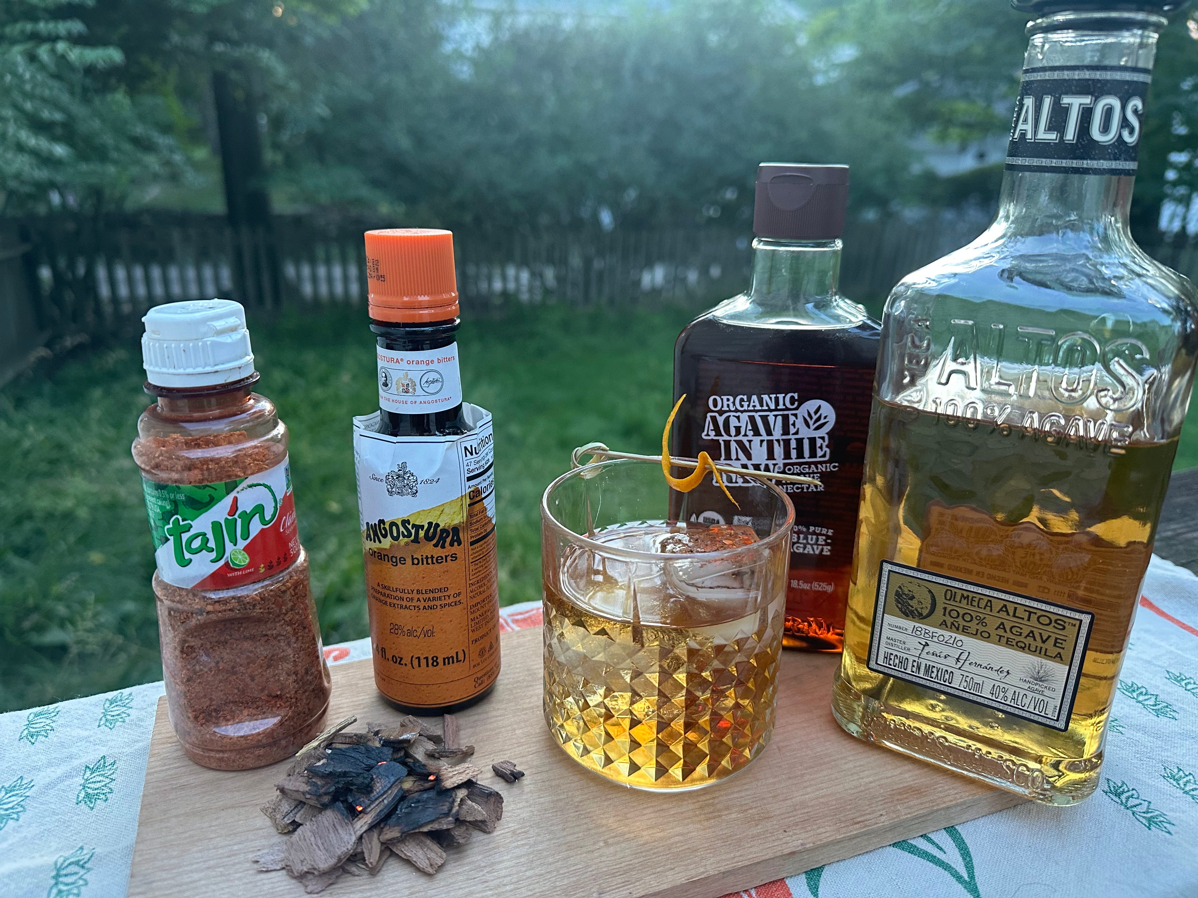 I decided to treat this bottle of anejo as if it was bourbon. A modern bourbon old-fashioned uses a little sugar and bitters to season a quality spirit — I think of it as adding salt and pepper to a steak. A dark agave syrup and a dash of orange bitters make solid replacements for simple syrup and Angostura in a tequila old fashioned. Since we’re in the depths of grilling season, it wasn’t hard to pick up some mesquite chips from the local hardware store and add a little smoke to the drink. (This cocktail follows the same recipe as my Cherry Tobacco Old Fashioned, with different ingredients.) Orange oil from the twist gives the tequila cocktail some fruit notes. Lastly, I couldn’t resist a tiny amount of Tajin to lend some salt, spice, and lime to the tequila. Those three flavors play so well with tequila. It’s almost criminal to omit them from a drink.