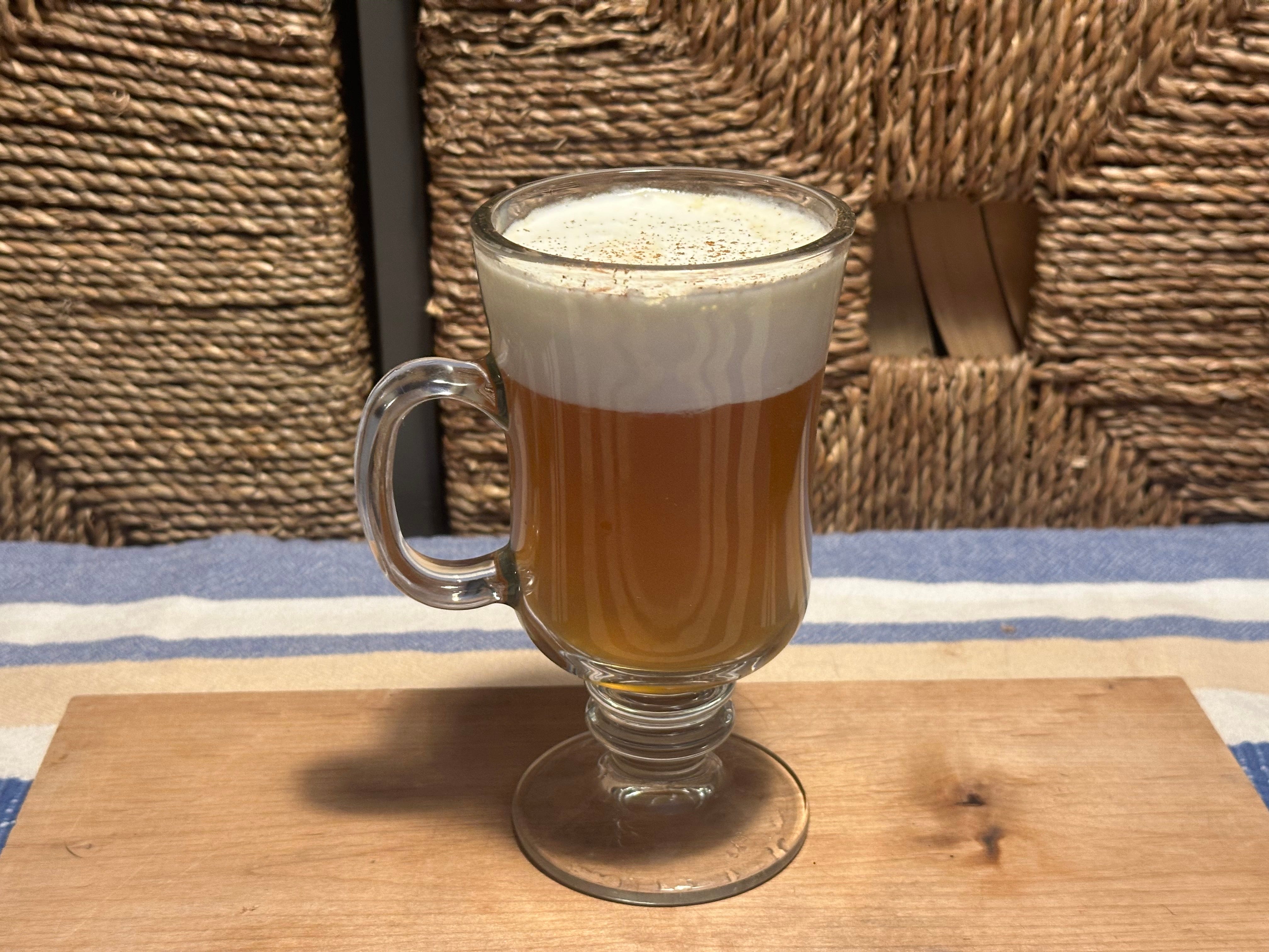 Add all ingredients but the cream and cider to your serving glass. Add cider to the glass, leaving 1 inch of room for cream at the top. Microwave the drink for 30 seconds. Gently whip the cream and pour onto the top of the cocktail. Garnish with a light sprinkle of cinnamon.