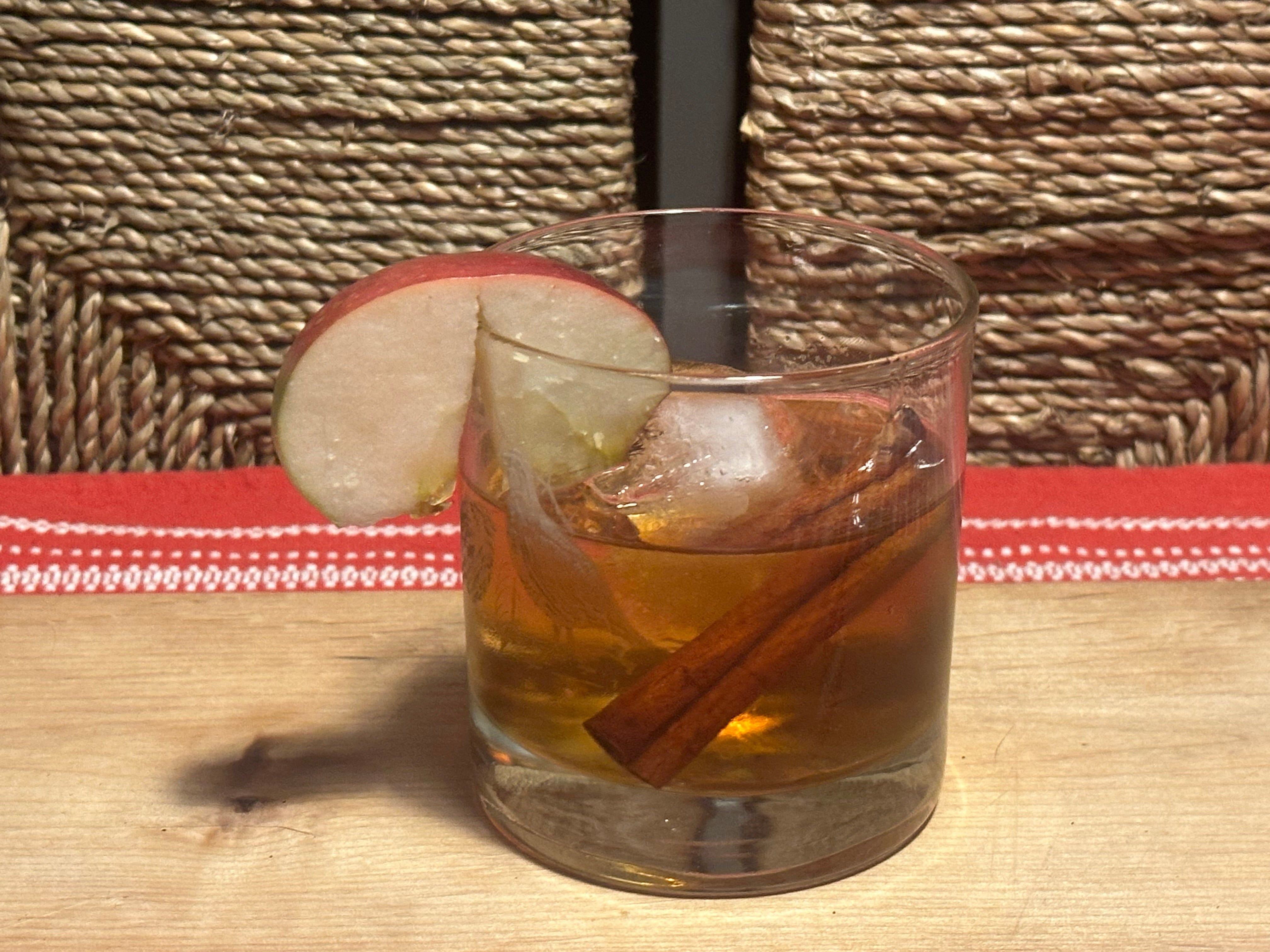 Garnishes: A fresh apple slice reinforces the core flavors of this cocktail. Singeing a cinnamon stick adds smoke and spice to the drink, completing the experience.