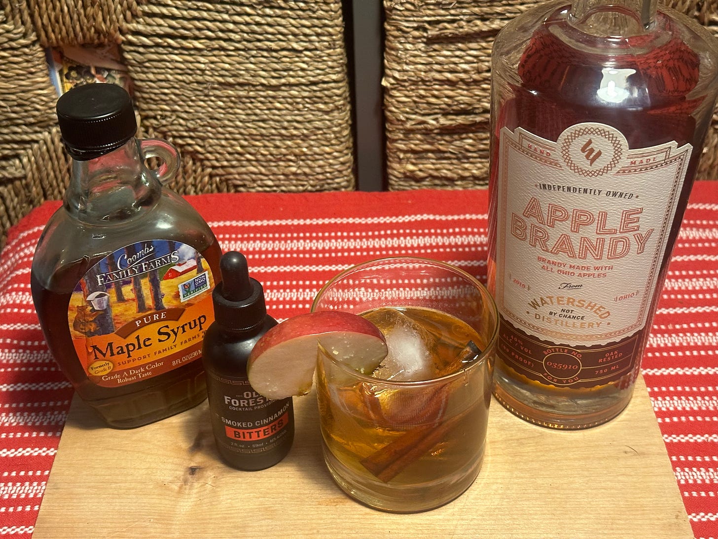 In a double old fashioned glass, add 1 large ice cube. Pour maple syrup and bitters to the glass. Add brandy. Stir 25-30 seconds, until the glass is chilled. Garnish with apple slice and cinnamon stick.