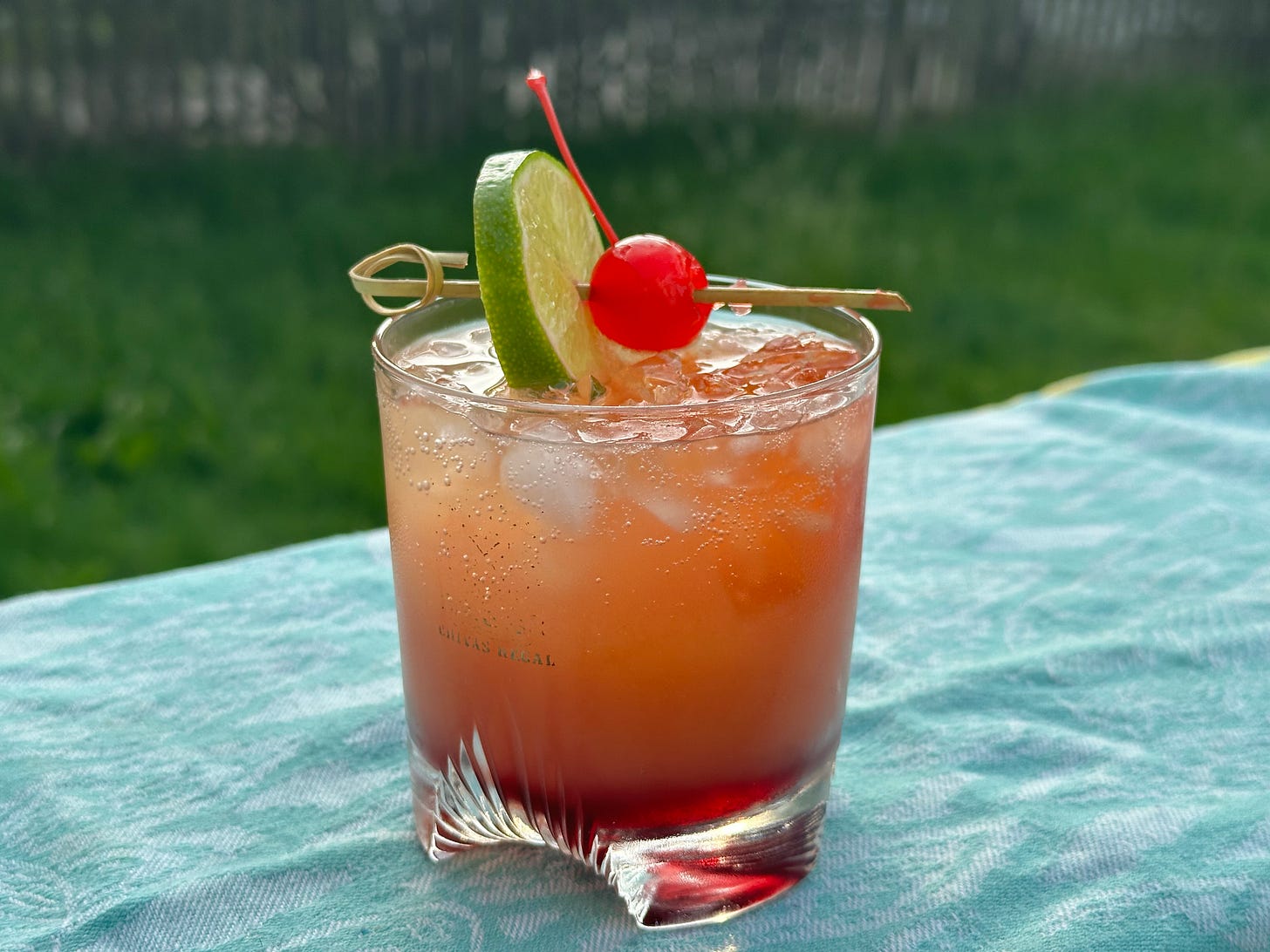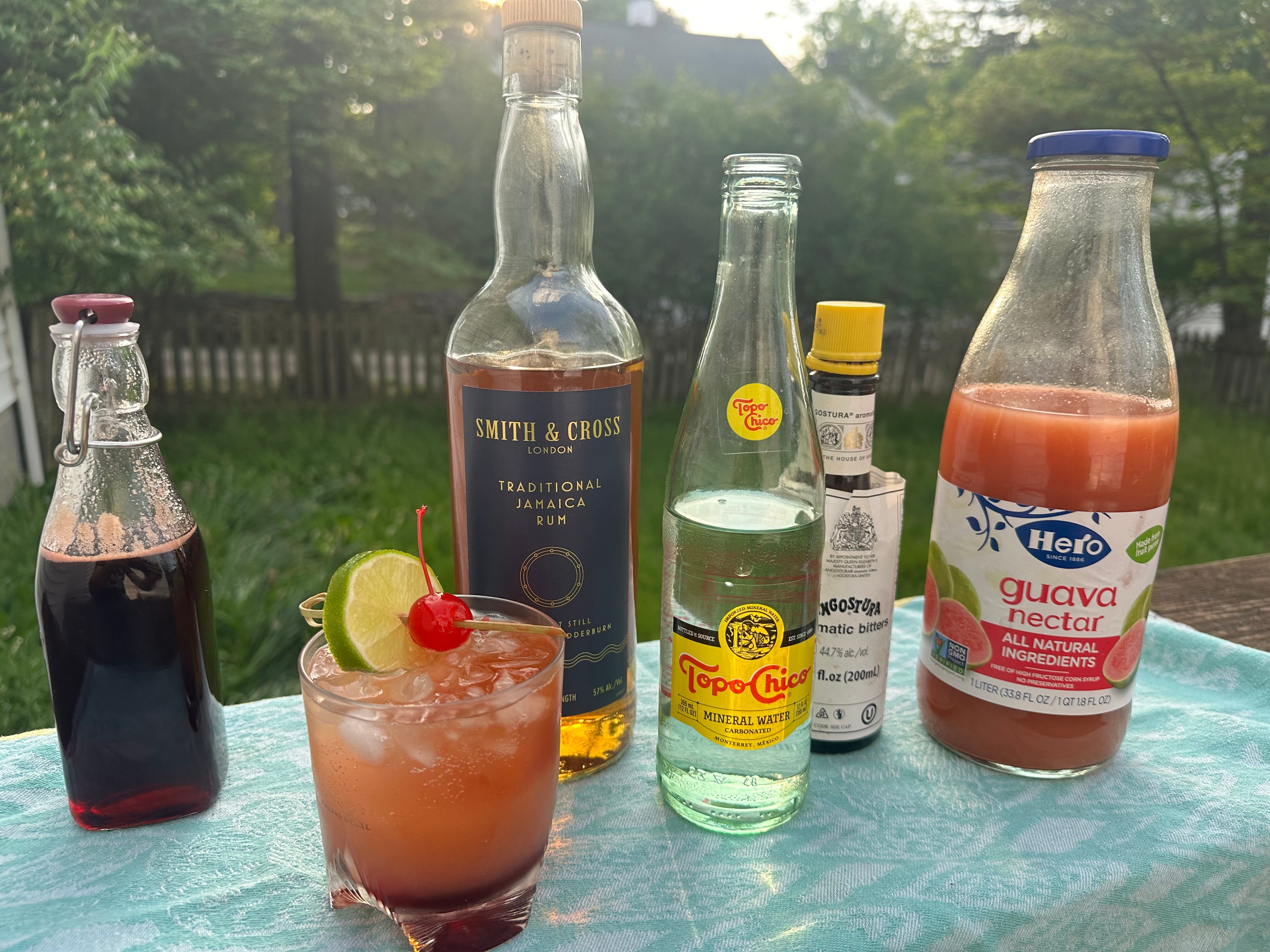Jamaican rum and tropical fruit are an easy pairing, but in the original proportions the guava juice and rum weren’t really combining well. It was a glass of rum and guava juice, not a cocktail. Erin’s recipe was pretty stingy with the lime and grenadine — and of course, my house recipe for grenadine is far superior to the premade junk you find at the liquor store. I bumped each ingredient up to a full ounce. I also added a dash of Angostura bitters to bring a touch of bitterness and spice to the drink. The Topo Chico provides bubbles and dilutes the thick, rich guava. Erin originally garnished this drink with a flaming lime shell, a trick I showed you all two weeks ago. I decided to keep things a little calmer with just a lime slice and cherry.