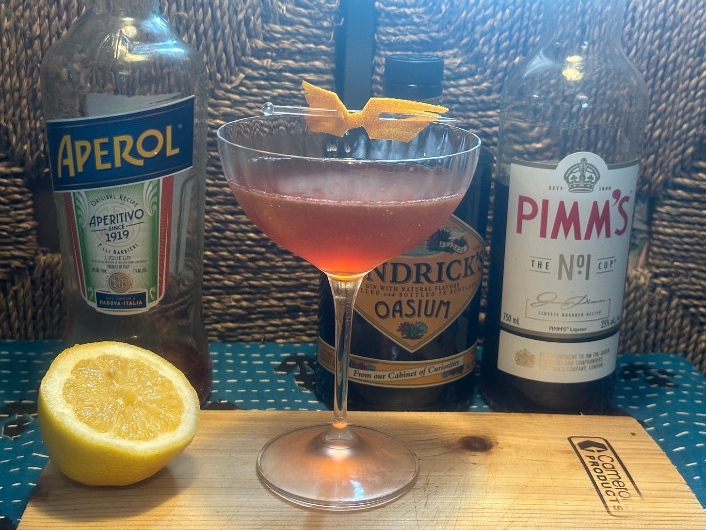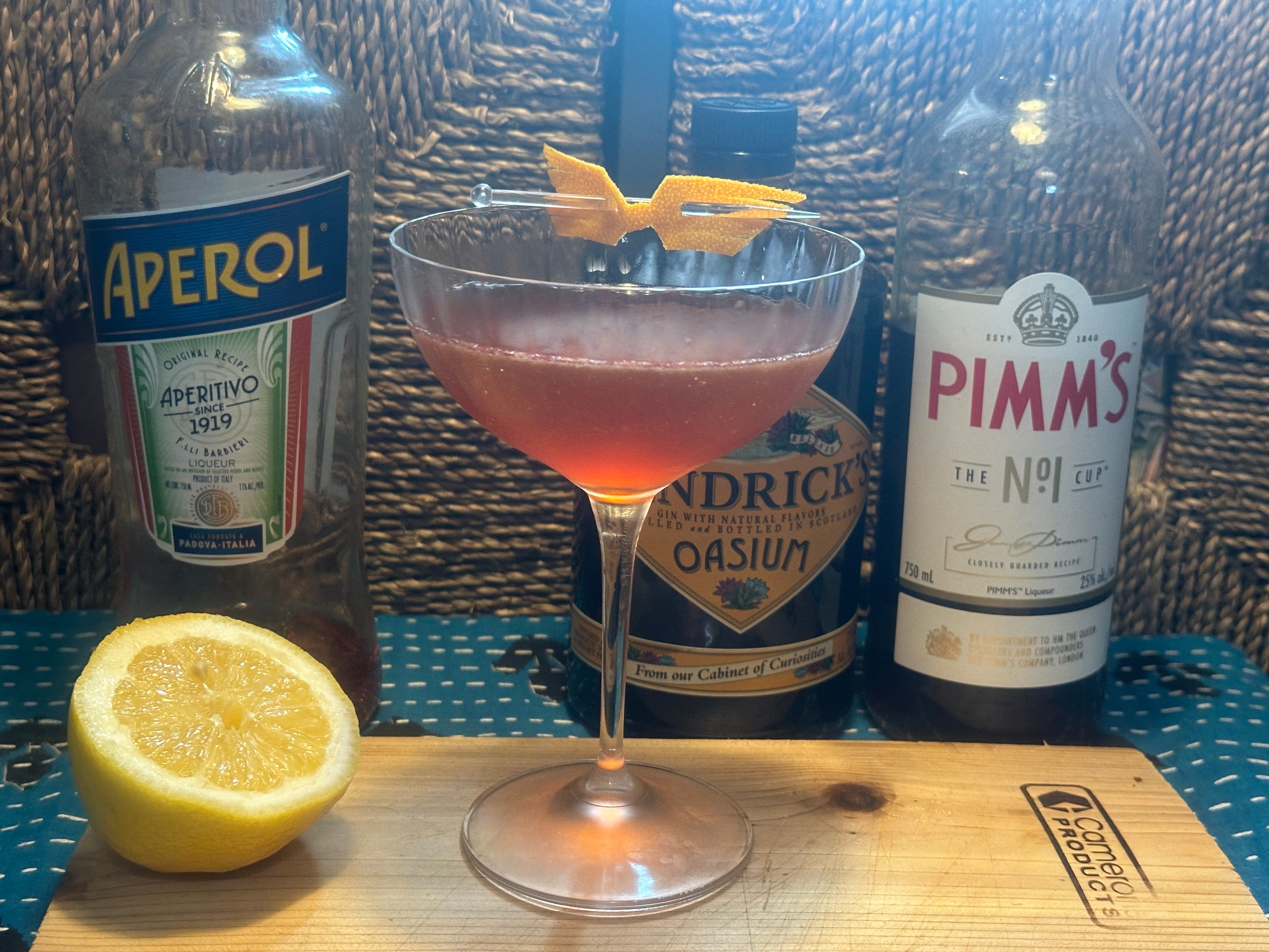 I wanted to lean into the Aperol and lemon juice aspects of the cocktail, but not lose all the complexity. As I rooted through my liquor cabinet, I found a neglected bottle of Pimm’s No. 1. This liquor is used almost exclusively in a Pimm’s Cup, but it had some promise as an amaro substitute. Pimm’s is also herbaceous, but it’s much more fruit-forward and genteel than a bitter amaro. The idea of Pimm’s and Aperol in a glass together made a huge amount of sense to me. A quick taste test showed promise.