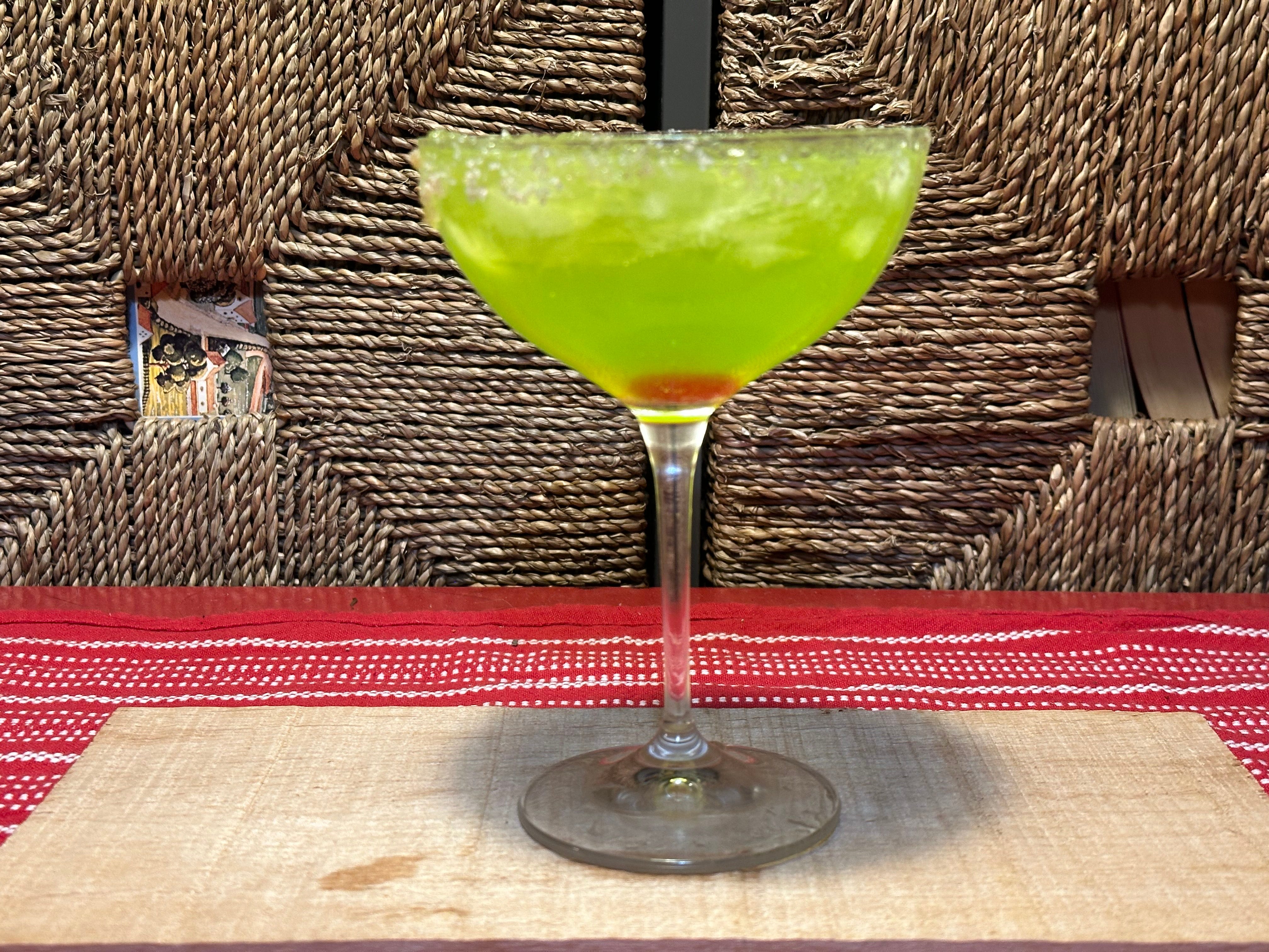 The obvious flaw in this drink from a modern view is the absence of a core spirit. Sweet liqueurs like Midori have no business being front and center in a drink. The sugar content is far too high to build anything like a balanced cocktail. I prefer to use a sweet liqueur as a substitute for sugar in a drink, instead of acting as the star of the show. In this case, the Midori replaces the agave syrup I’d normally use in a standard margarita. It’s worth noting that not all sweet things are equal. Taste Midori neat and you’ll go into sugar shock, but it took two ounces of Midori to balance out the lime juice in this glass. In comparison, I use ¾ of an ounce of agave syrup to balance an ounce of lime juice in my standard margarita recipe.