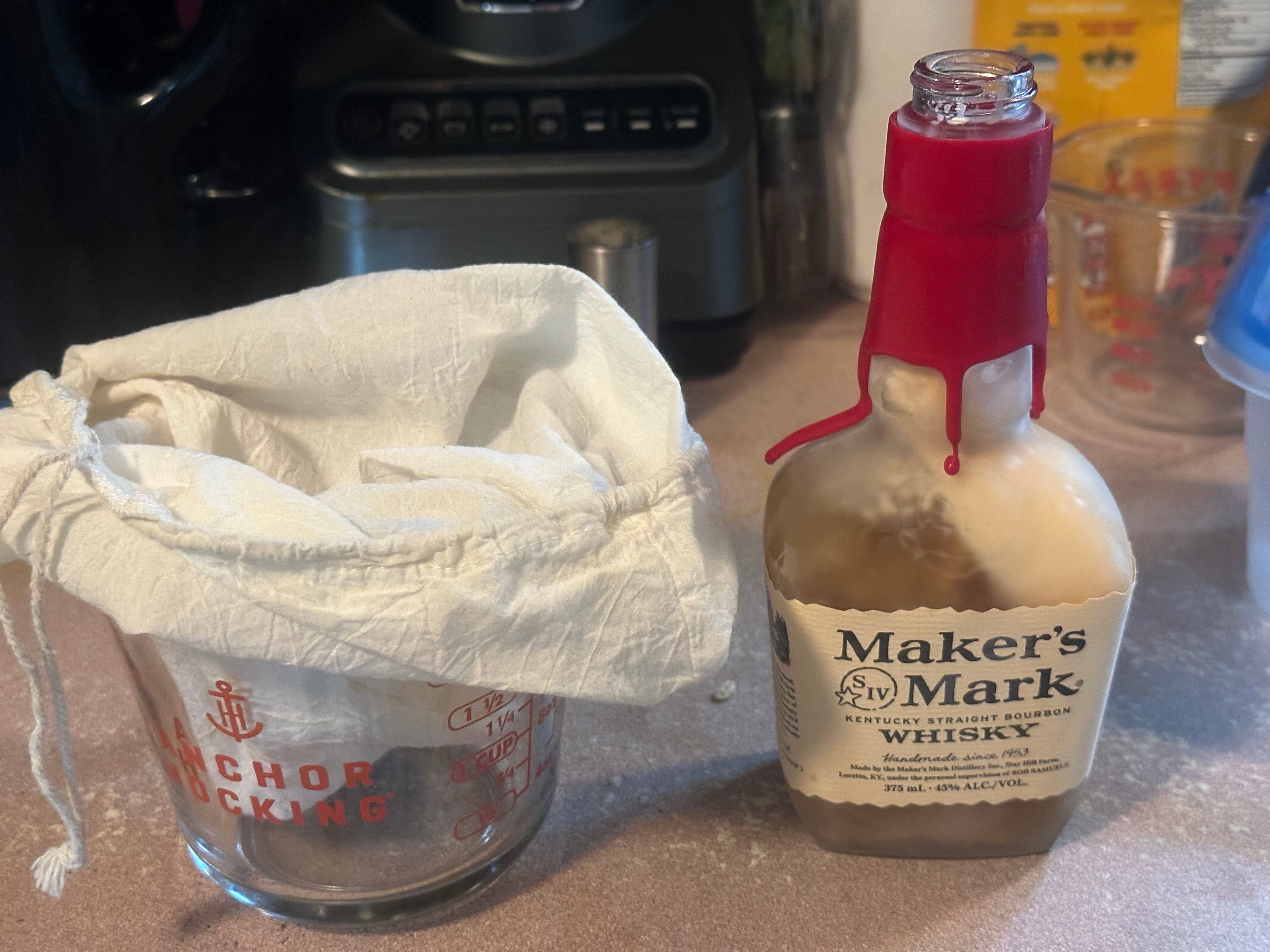 Fry the bacon to render the fat needed for the recipe (use your favorite method). Pour off ¼ cup of bourbon from the pint of Maker’s Mark. Add ¼ cup of bacon fat to the Maker’s Mark bottle. Cap and shake vigorously. Place in the freezer for 24 hours, preferably at a 45-degree angle. Poke a hole through the fat and pour the bourbon through a fine strainer. Keeps indefinitely in the fridge.