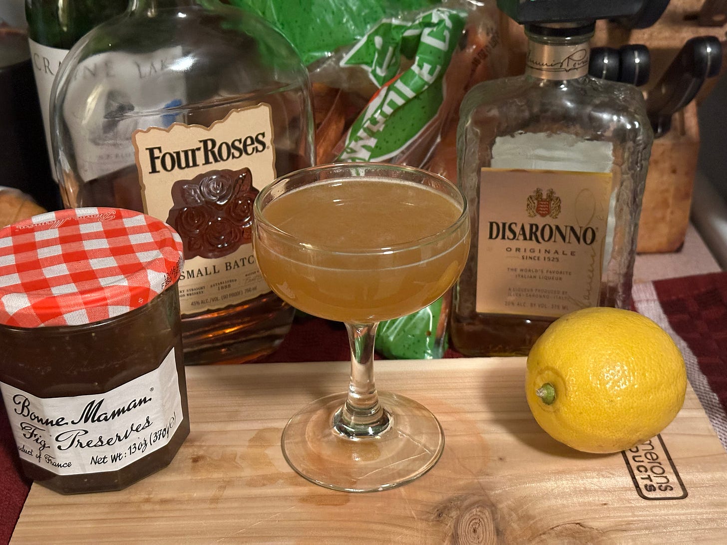 Honey Fig Syrup: This gets super easy if you have a small glass measuring cup. Dump the water, preserve, and honey into the glass and microwave it for 30 seconds or so. Once it’s warm but not boiling, give everything a good stir. Natural preserves are a must; any variety of real honey will be fine. Do not cannibalize Fig Newtons to make this cocktail. It can’t possibly go well.