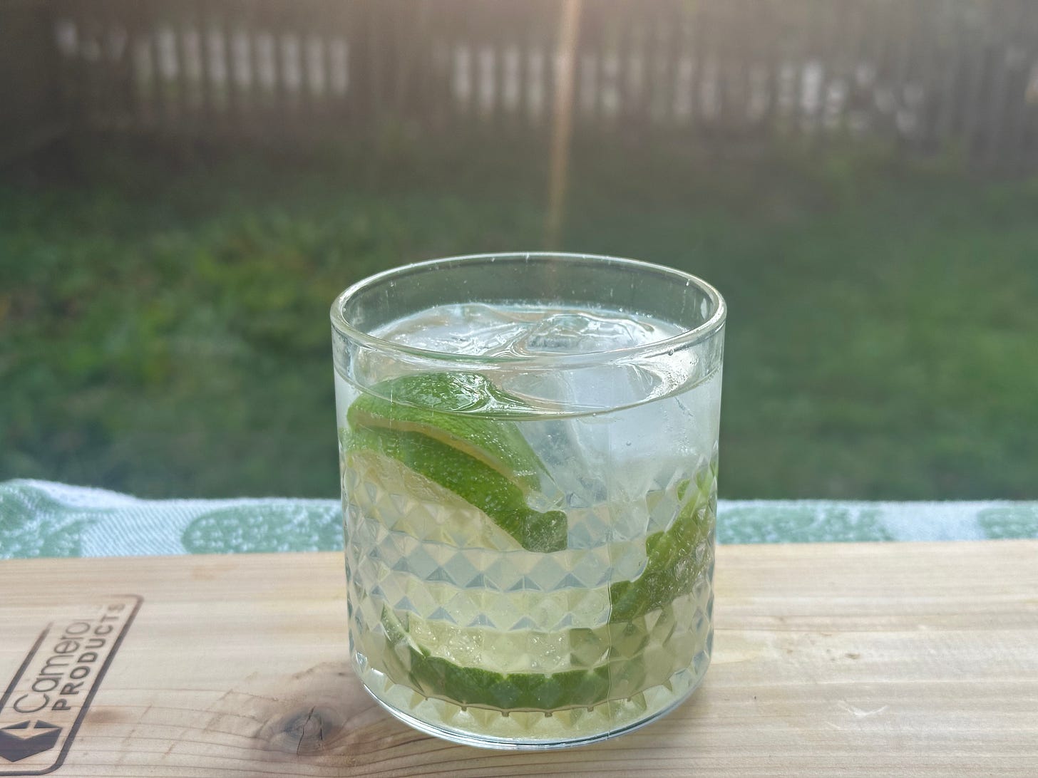 Remember that careful, measured, precise take on the daiquiri I wrote about a while back? Yeah, well, that’s not the place for this. This daiquiri variant is all about attitude. Muddle those lime slices like you mean it — you need to extract the lime oil from the peel as well as some juice, and if you end up with fruit pulp in the drink so much the better. Simple syrup? Nah. just stir some sugar with the lime juice and bitters. It’ll all work out. A pure caipirinha is just sugar, lime, and booze, but I tossed in some orange bitters for a little complexity, some salt to boost the flavor, and some club soda to kill the burn. Cachaça is a rough beast. You need to show it you’re the boss.