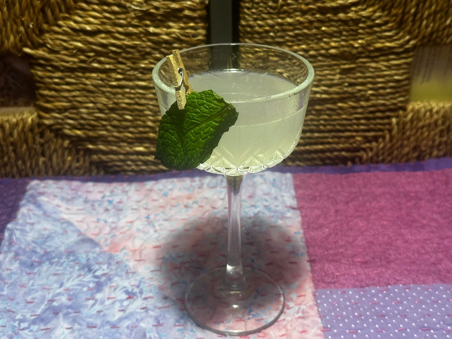 Splash a small amount of orange blossom water into a Nick and Nora or small coupe glass. Swirl the orange blossom water until the inside of the glass is thoroughly coated, then discard the excess. Shake the remaining ingredients in an iced cocktail shaker. Double strain into the Nick and Nora glass. Garnish with a mint leaf.