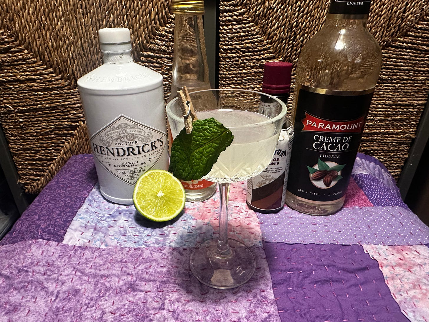 I firmly believe that Ms. Gracie is a rock star among distillers. When a guitar virtuoso steps onto your stage, you don’t try to compete with them. You strap on the bass guitar, listen closely, and do your best to support their artistry. This cocktail is basically a gimlet, one of the oldest gin cocktails in the world. The structure is the same as a daiquiri or a lemon drop martini. The power move comes from using creme de cacao instead of sugar as a sweetener. Creme de cacao, in moderation, doesn’t taste like chocolate. It adds sweetness and earthiness to a drink, but it doesn’t provide Hershey-bar notes. In this glass, it draws the gin’s cocoa finish to the middle of the flavors, where it meets the orange-blossom aromas of the prepared glass. The cocoa bitters smooth out some of the drink’s bumps, harmonizing the taste. It’s a very different sort of gimlet, floral and earthy in places where you’d expect crisp, spiced notes. There are worse ways to endure a last gasp of winter.