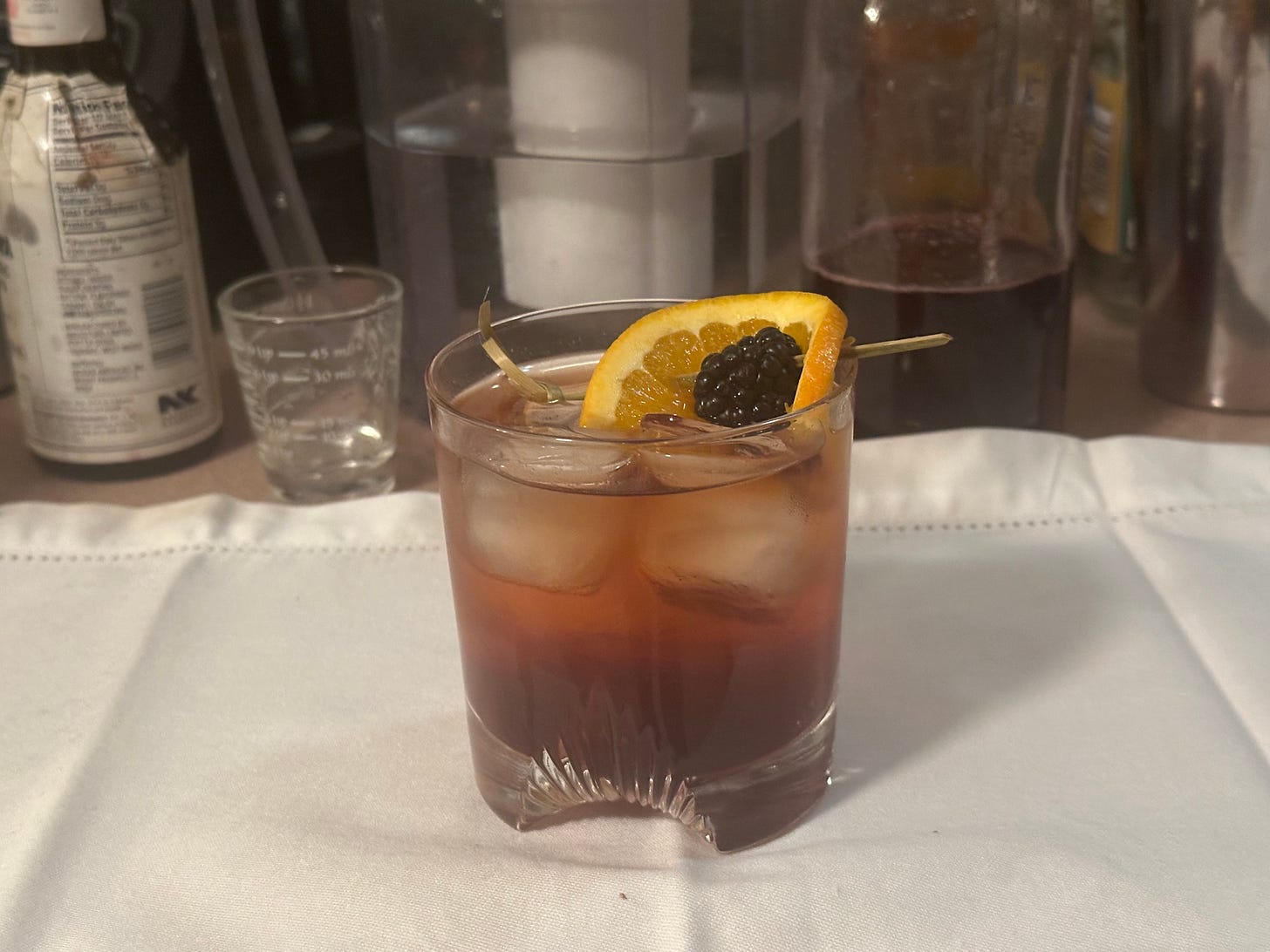 A big part of what makes this drink work is the choice of brandy over bourbon for the base spirit. Wisconsin is obsessed with brandy. Wisconsin consumes half of all the cases of Korbel brandy produced in an entire year. I’ve seen competing historical arguments for why this is so, but I believe it boils down to tradition. Korbel became associated with quality brandy generations ago, and Wisconsin cocktail culture is very set in its ways. Brandy is extremely versatile; it picks up and carries flavors in a way that more assertive liquors refuse to do. The blackberry flavors in this drink would be overwritten by a spicy, potent rye whiskey (my usual base for an Old Fashioned).