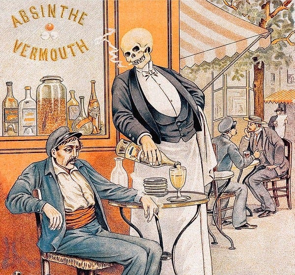 Prosecutors blamed the absinthe in Jean’s system for the murders. The defense argued that the vast quantities of wine and cognac were more to blame, but conservatives were itching to portray absinthe as a poison destroying the character of the nation. Here was their chance. For decades, the Green Fairy had been the drink of choice for artists and bohemians. Moral scolds noticed, producing pseudo-scientific gibberish “proving” that absinthe madness could rot your brain if you so much as touched the stuff. Jean’s murderous rampage was the match that lit the flame; absinthe was banned in Switzerland in 1910, and the rest of the world followed. It took a century for genuine scientific inquiry to figure out that wormwood had almost no hallucinatory qualities (although it is similar, chemically speaking, to THC). Turns out drinking 100 proof liquor is the real culprit in absinthe madness. Go figure.