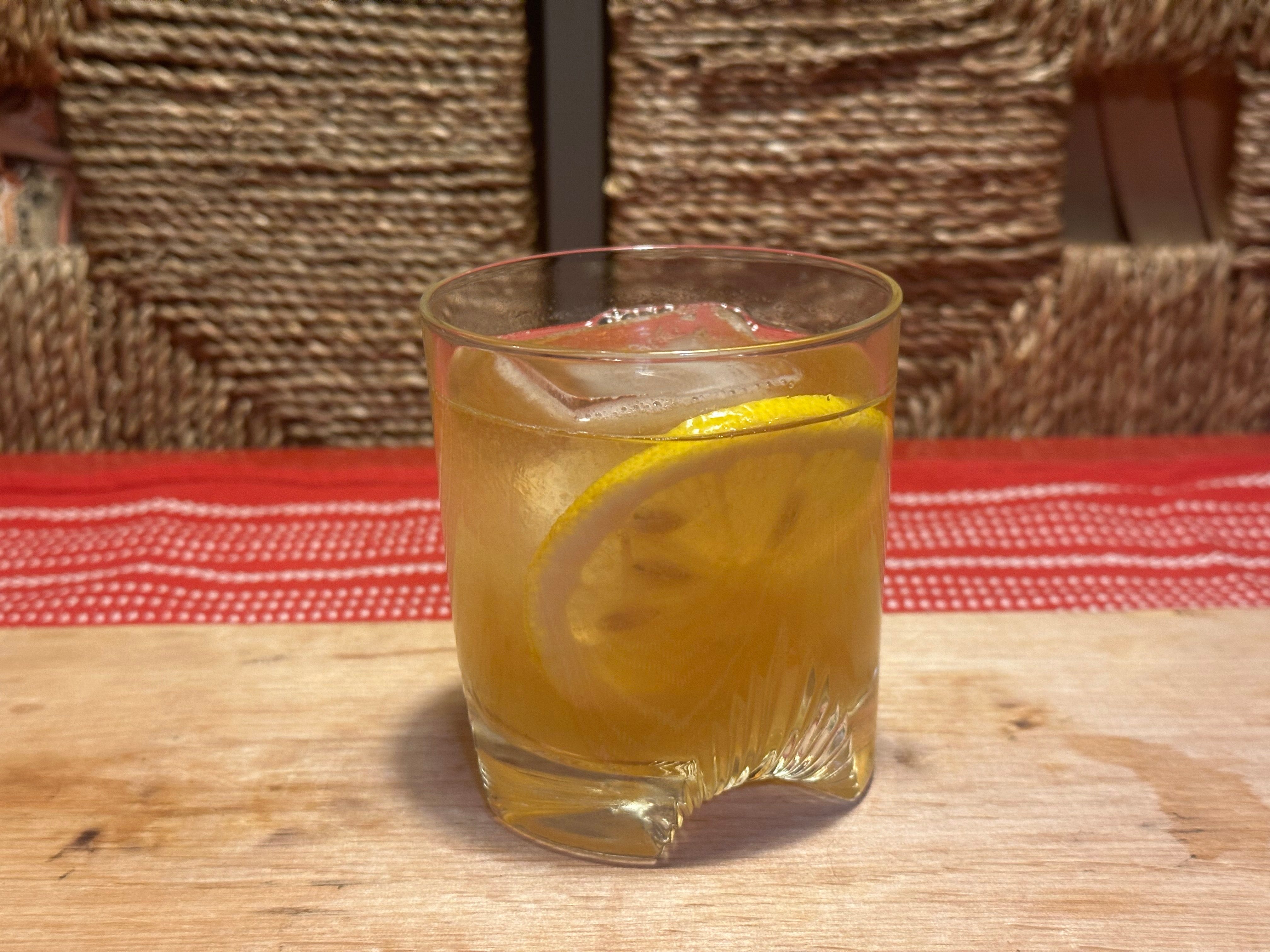 Add all ingredients to a cocktail shaker over ice. Shake and strain into a highball glass over fresh ice. Express an orange twist over the glass, garnish with a lemon slice, and serve.