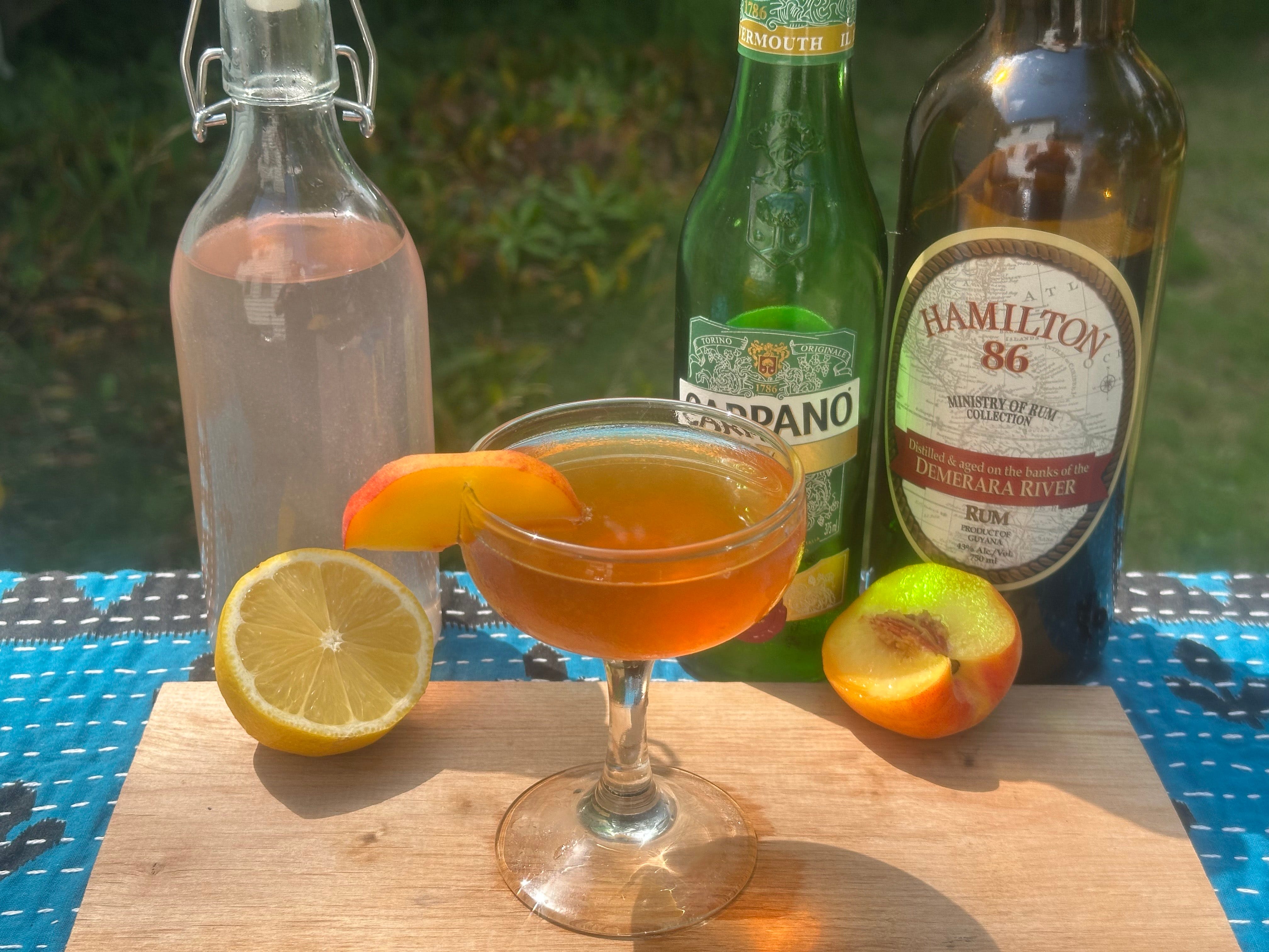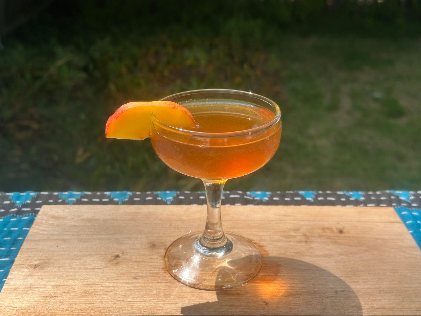 Shake all ingredients over ice and pour into a chilled coupe glass. Garnish with a fresh peach slice.