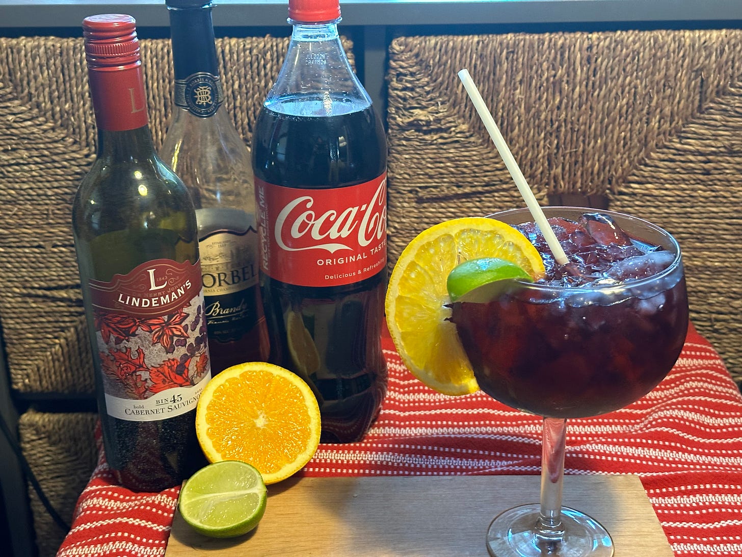 Sangria has never had what you’d call a distinguished pedigree. Ostensibly Spanish, it took off as an American cocktail after it was handed out at the Spanish kiosk at the 1964 World’s Fair. In all fairness, people have been tossing sugar and fruit juice into lousy wine since wine was invented. Normally I’d be making some simple syrup and adding more juice to make “real” sangria, but who wants to turn on the stove in this heat? Sweet cola does the trick just fine.