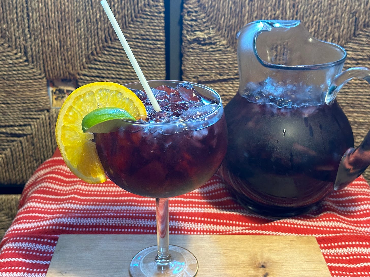 Greetings, Wonketeers! I’m Hooper, your bartender. True confession: I love sangria. Specifically, I love cheap, premade, not-very-nice sangria — the stuff that tastes like alcoholic Kool-Aid. I’ve killed more than a few bottles of this stuff with my wife on late summer nights. Fond memories make cheap booze taste delightful. But this version of sangria takes “cheap” to a whole new level. Bottom-shelf red wine and Coca-Cola? Sign me up. Let’s make a pitcher of Kalimoxto. Here’s the recipe: