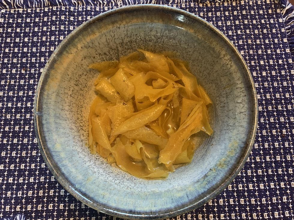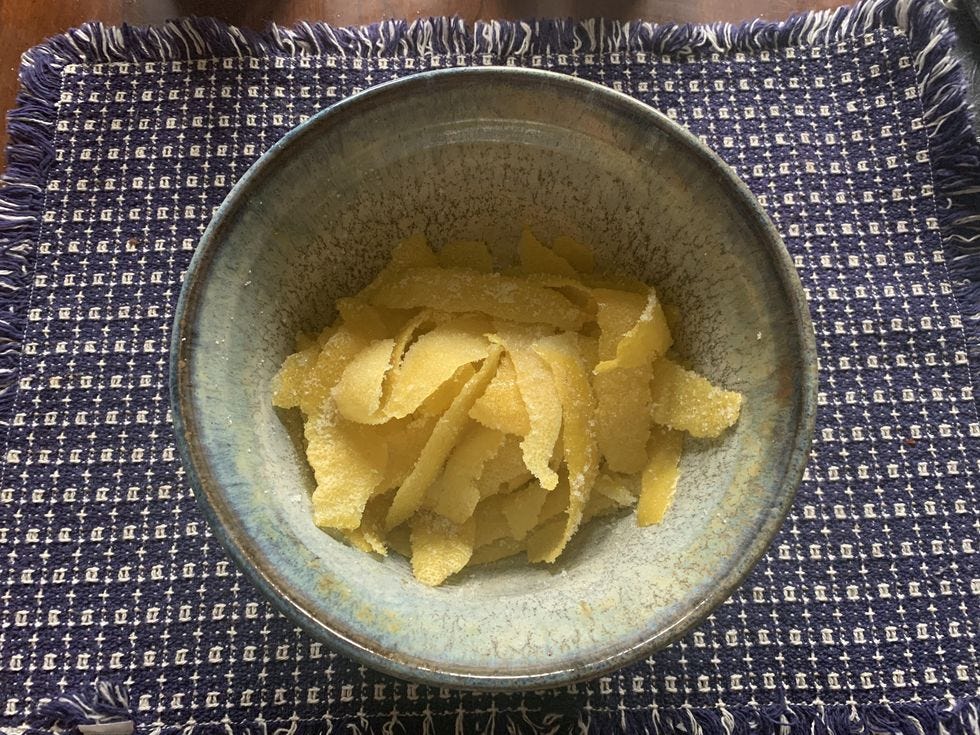 Cover the bowl with plastic wrap and leave at room temperature for a day or so. After that rest, the lemon peel will have changed radically: