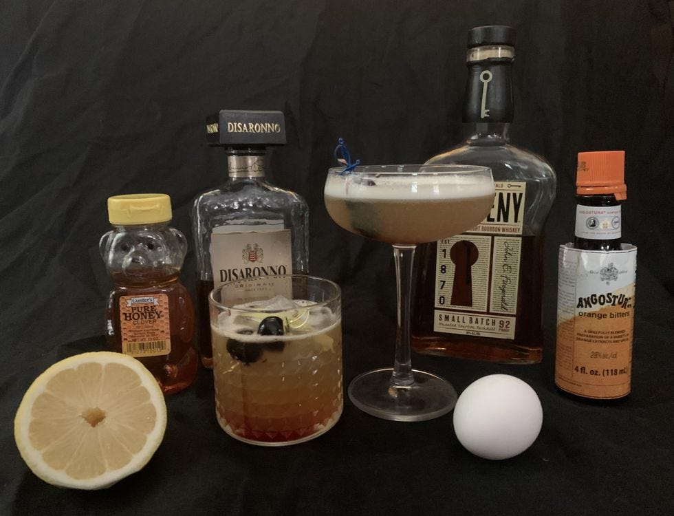 Technique: The first shake on this cocktail builds up the meringue. Don't skimp on shake time with your initial "dry shake." The second shake with ice cools and finishes the cocktail. Letting the cocktail rest a few minutes is important as well. Initially, the drink will have a lovely light almond color, but will taste astringent. Wait a little bit. The foam will settle to the top, and it'll be easier to find the almond and honey notes in the glass.