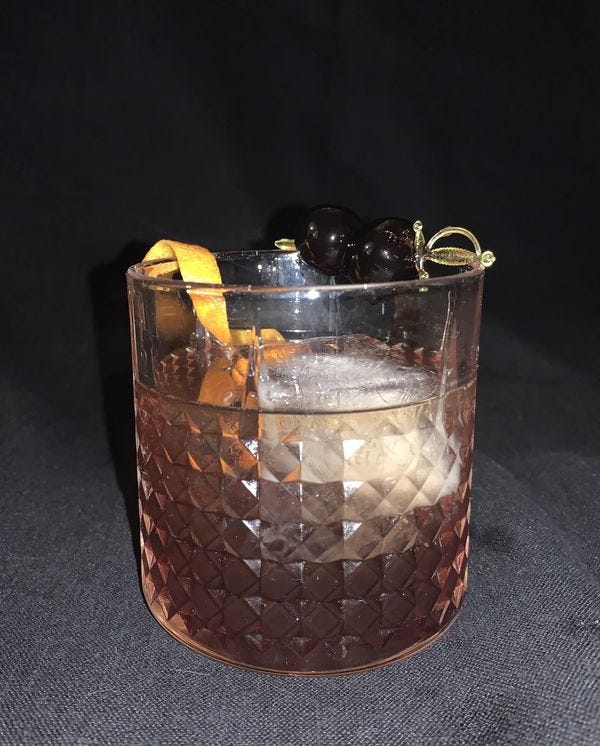 Combine all ingredients in a mixing tin with ice. Stir until cold, 8-12 seconds. Pour into and old fashioned glass with one large ice cube. Garnish with two Luxardo cherries and an orange twist.