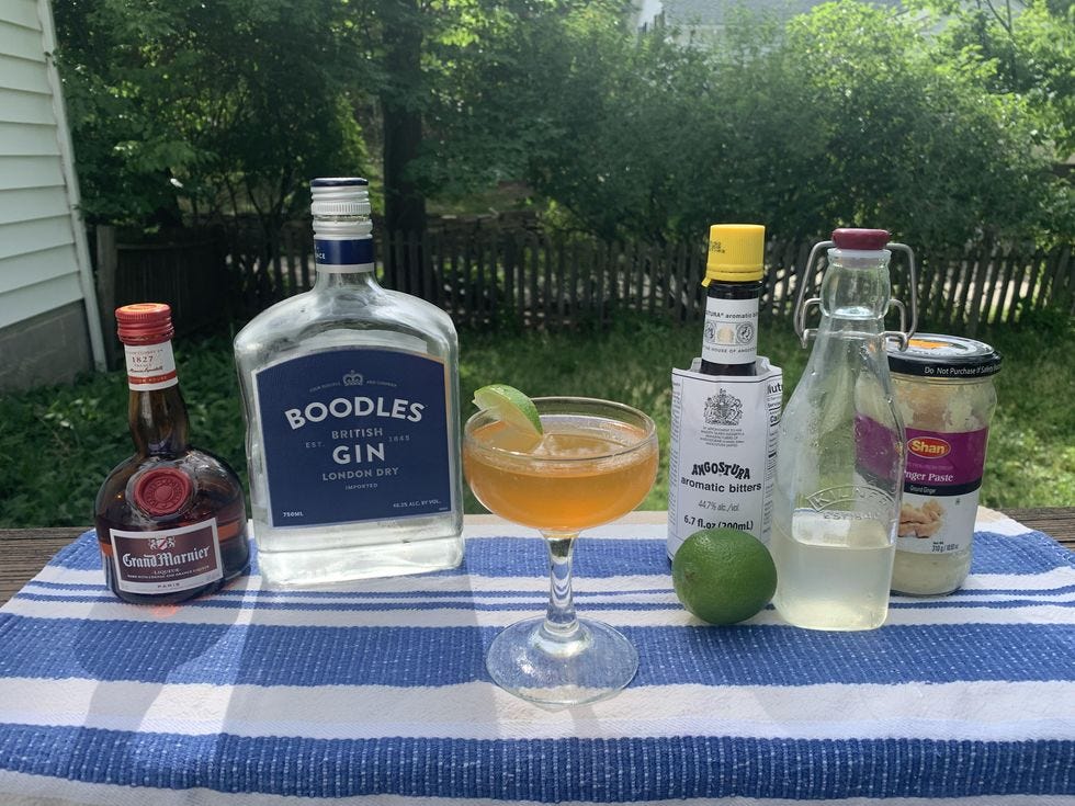 The original cocktail recipe didn’t have any sweeteners beyond the Grand Marnier. That isn’t sweet enough for modern palates. I added some more sugar to balance the tartness. The Angostura bitters provided some spice notes that were very welcome. Still, the original drink was bland and unmemorable. I wanted to give the cocktail some subtle Asian notes, to emphasize its place of origin. A mild cooked ginger syrup turned the trick. Nothing too fiery, but something to brighten and re-center the cocktail. Just the thing to sip while watching the sun set over an empire.