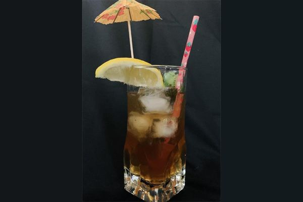 Add the soda water to the bottom of a highball glass. Add the rest of the ingredients to your mixing glass. Shake, strain, and pour on top of the soda water. Gently add ice to the glass. Garnish with a mint sprig and a lemon wedge topped with a paper umbrella.