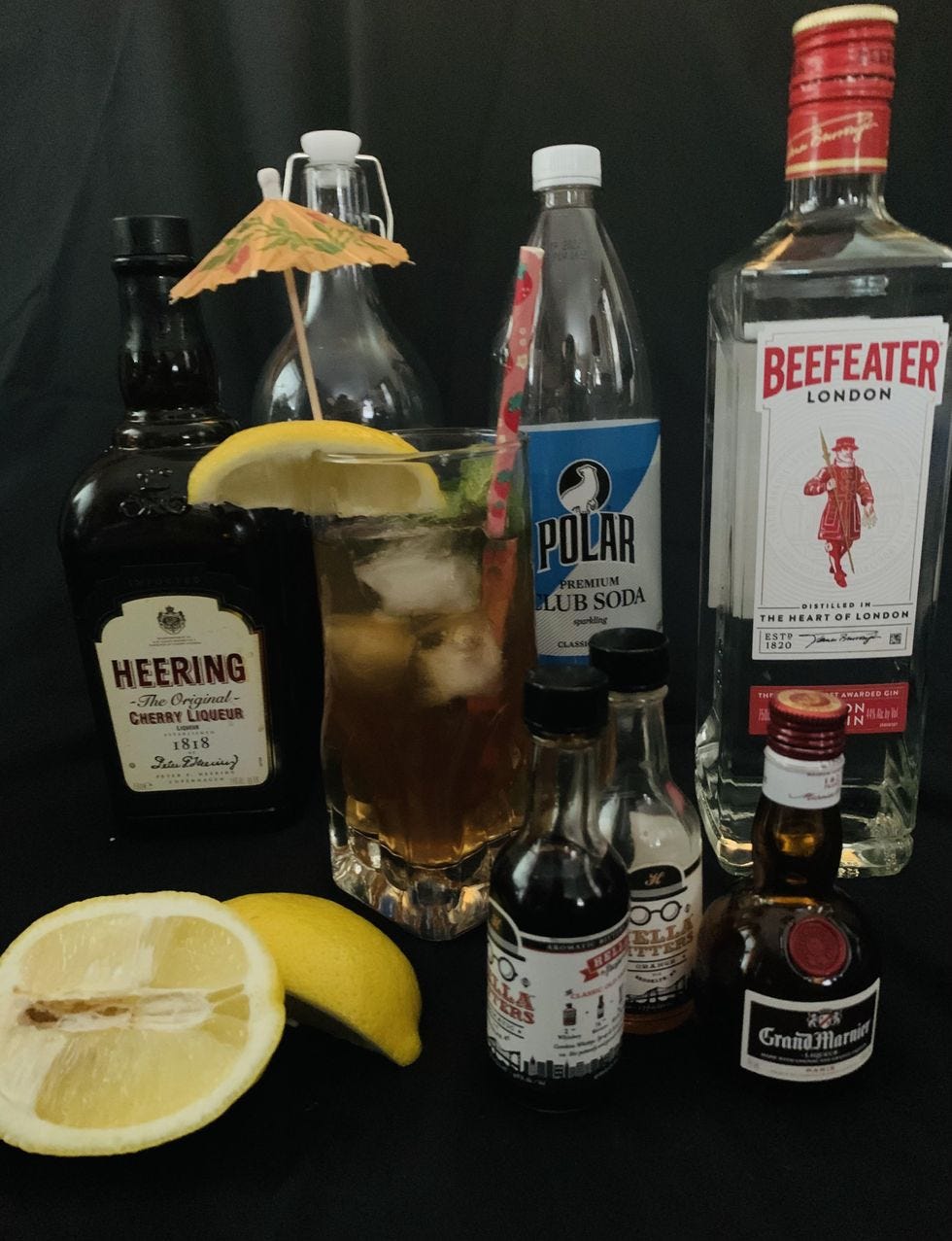 Greetings! I'm Hooper, your bartender. Hold on to your paper umbrellas, folks. We're going hard core tiki. How hard core? Try turn of the century, gin based, what-is-that-weird-liquor hard core. Here's my take on the Singapore Sling. Recipe's below.