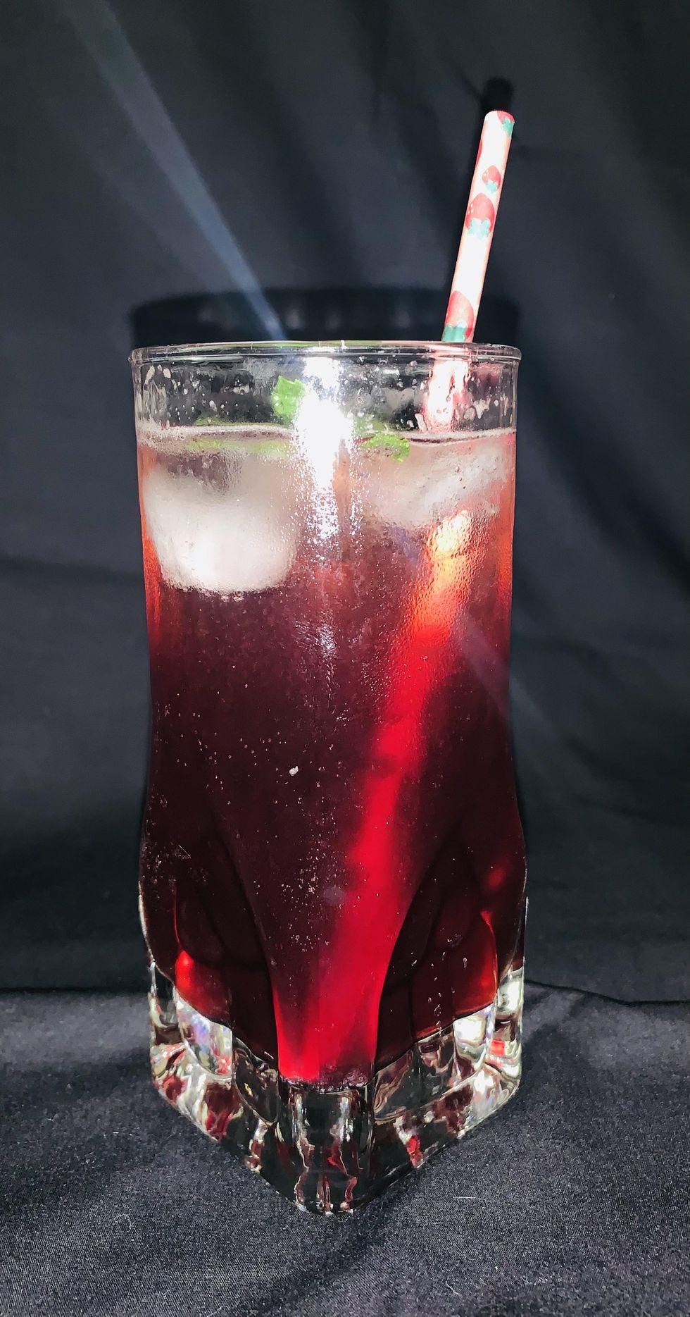 There's no good way to make a non-alcoholic Singapore Sling, but some tart cherry juice, lemon juice, and demerara syrup get you in the right neighborhood. Mint gives us some bright herbal notes to round things out. I decided to name this one the Maris Stella, after a convent in Singapore — this is a "virtuous" Singapore Sling, after all. Tart cherry juice is pricey but worth it — I used Lakewood Organic juice.