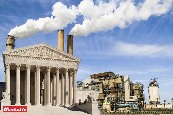 [ West Virginia et al v. EPA / NYT / Image credits: SCOTUS by Jarek Tuszyński, Creative Commons License 3.0, industrial background by 'Indie_charles,' public domain) ]