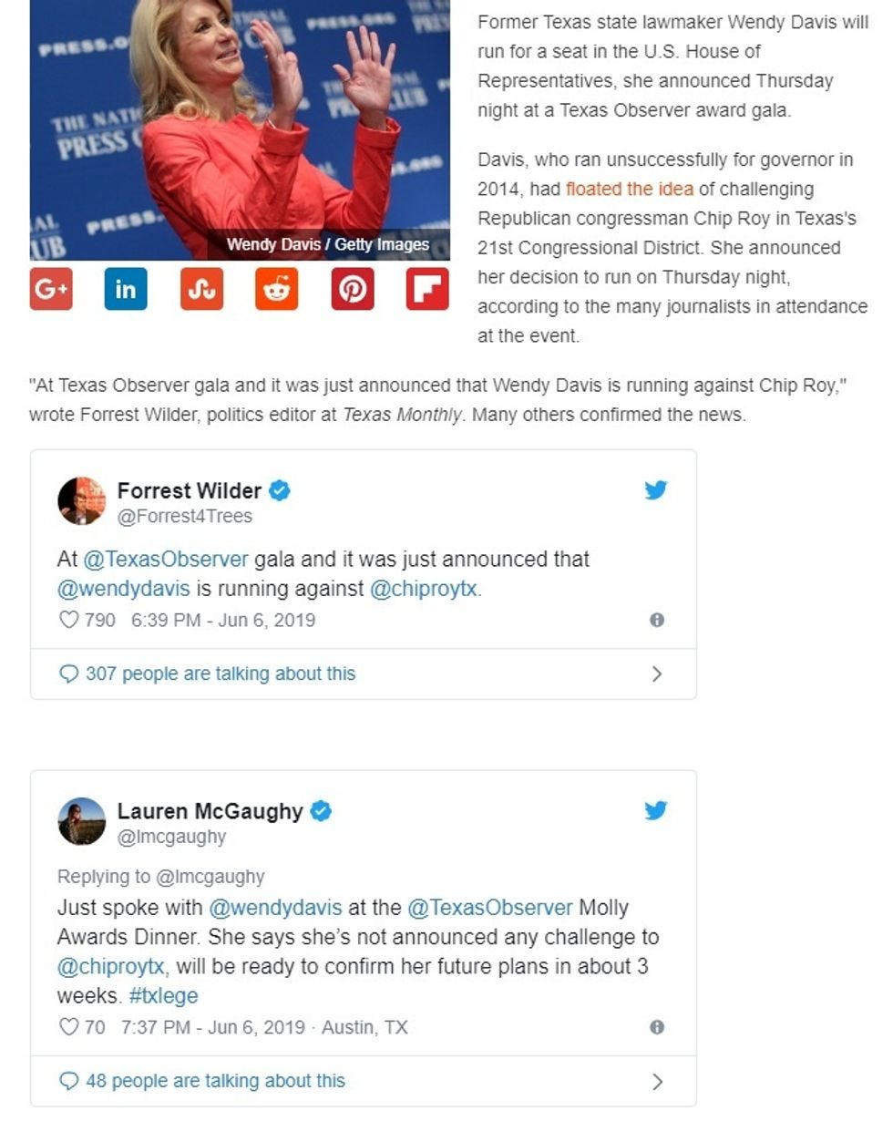 And the Washington Free Beacon ("Wendy Davis Announces Run for Congress") also got in on the act, misreporting that Davis herself had made the announcement, quoting the same tweet as the others, and adding "Many others confirmed the news." Weirdly, as an example, the story reproduced, without apparently noticing the actual words, the Lauren McGaughy tweet clarifying that Davis hadn't announced anything at all.