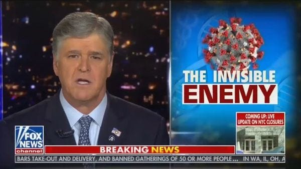 And then there's the Sean Hannity-specific stuff, like Hannity callingmedia coverage of the novel coronavirus a "new hoax" the Left was using to "bludgeon" Trump, and " Sean Hannity Knows How To Eat Hot Dog In Time Of Coronavirus, It Is The Easiest," which was about Sean Hannity eat hot dog.