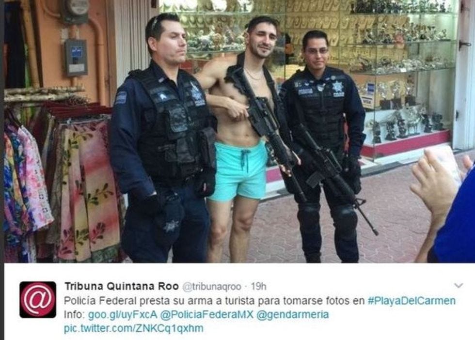 In other Turista hilarity being reported this week, Mexican social media is also blowing up over a Twitter photo of a tourist (home country unidentified) posing with a shit-eating grin while holding an automatic rifle (magazine removed, but still) borrowed from a Mexican federal police officer in Playa del Carmen -- the anger is partly directed at the dumb tourist, but mostly aimed at police, who manage to keep showing up in fun tourist photos instead of actually cracking down on drug-related crime in the area. But the tourists are having loads of fun and spending valuable dollars, which is what Mexico is there for, isn't it?
