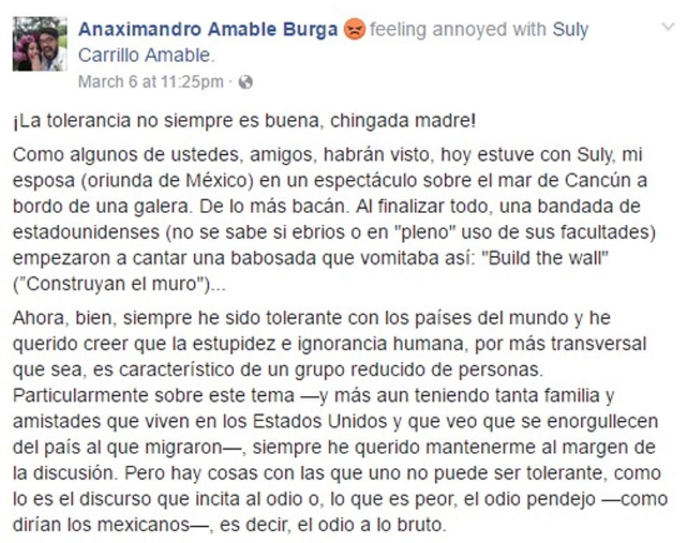 “Today I was with Suly, my wife (who is a native of Mexico), watching an entertainment show off the coast of Cancun aboard a boat, and at the end of the show, a flock of Americans (maybe under the influence of alcohol, or maybe not), began to sing the infamous “Build that wall” chant louder and louder”.