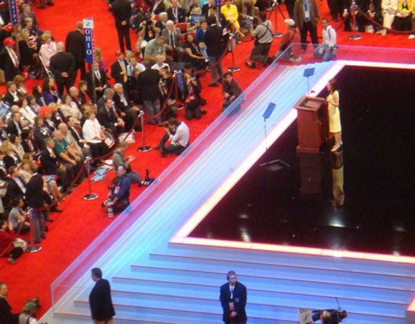 Did you see child embryo harvester loser Michele Bachmann speak, just now? She was looking pretty! Her speech was tragically boring, by Bachmann Standards, but shedidsay on CNN last night that Sarah Palin has more experience than "Barack Obama and Joe Biden combined ." Oh god now there is some young gal lip syncing on on the stage. Btw, look at those glass panels in front of the steps to the glossy stage. The steps are INACCESSIBLE and fraudulent, just like this whole thing, bah. AND STILL no one is here.