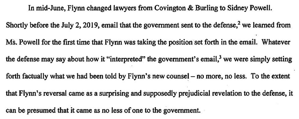 Here is the government saying WAIT, WHAT THE HELL, and confirming that this new Flynn story arose after Flynn fired his old lawyers from the firm of Covington & Burling, and hired his new lawyer, from the firm of You've Gotta Be & Fucking Kidding Me: