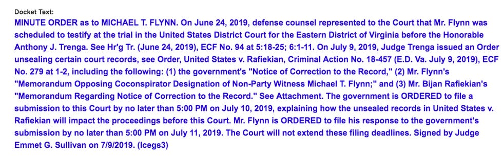 On July 9, 2019, Judge [Anthony] Trenga issued an Order unsealing certain court records [...] including the following: (1) the government's "Notice of Correction to the Record," (2) Mr. Flynn's "Memorandum Opposing Coconspirator Designation of Non-Party Witness Michael T. Flynn," and (3) Mr. Bijan Rafiekian's "Memorandum Regarding Notice of Correction to the Record." [...]The government is ORDERED to file a submission to this Court by no later than 5: 00 PM on July 10, 2019, explaining how the unsealed records in United States v. Rafiekian will impact the proceedings before this Court. Mr. Flynn is ORDERED to file his response to the government's submission by no later than 5:00 PM on July 11, 2019. The Court will not extend these filing deadlines.