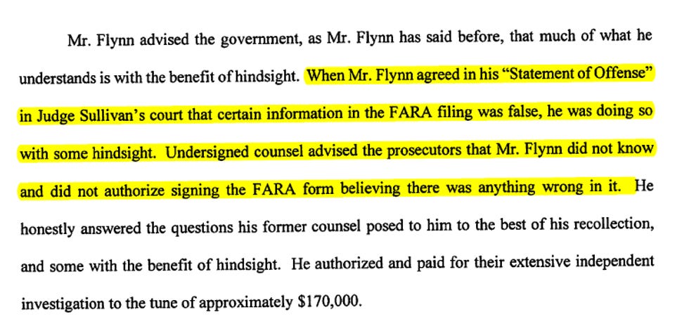 But he didn't mean to, Your Honor, HONEST! Here is where Flynn's special wingnut Sidney Powell says in a new filing that Flynn understands now that his (retroactive!) FARA filing was bullshit, but that is because of "the benefit of hindsight," and not because he thought he was yakking out fibs at the time , even though he admitted to that very thing months ago:
