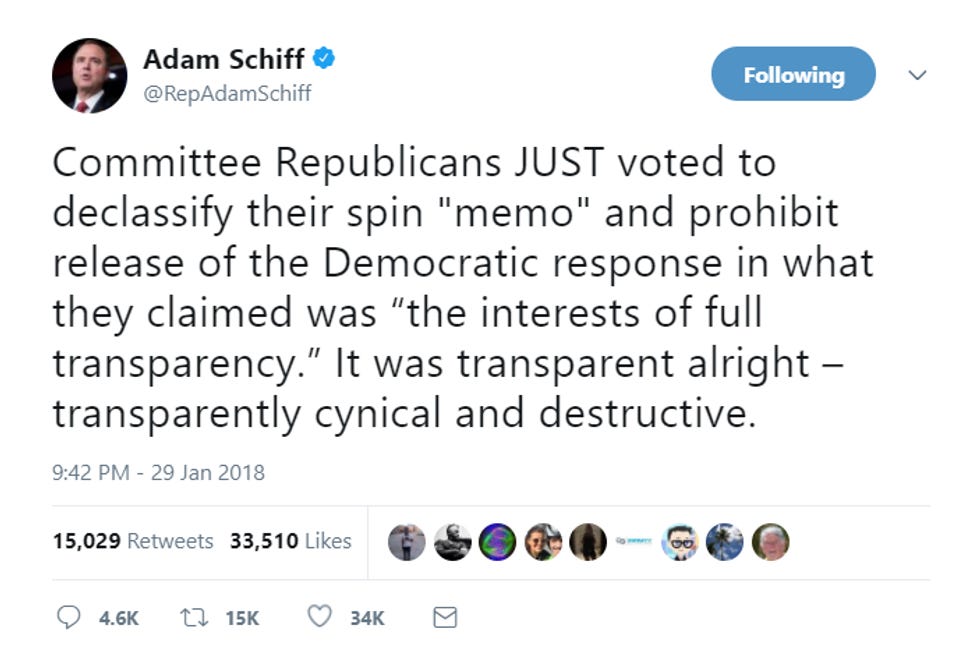 House Intelligence Commmittee Democrats, led by Adam Schiff, had prepared their own point-by-point rebuttal memo to Nunes's XXX Penthouse Trump fantasy letter, but the committee voted along party lines to keep that one under wraps, because Nunes's plan to obstruct justice for his sexxxy daddy in the Oval doesn't work if Democrats are allowed to inject things like "honesty" and "truth" into the debate.