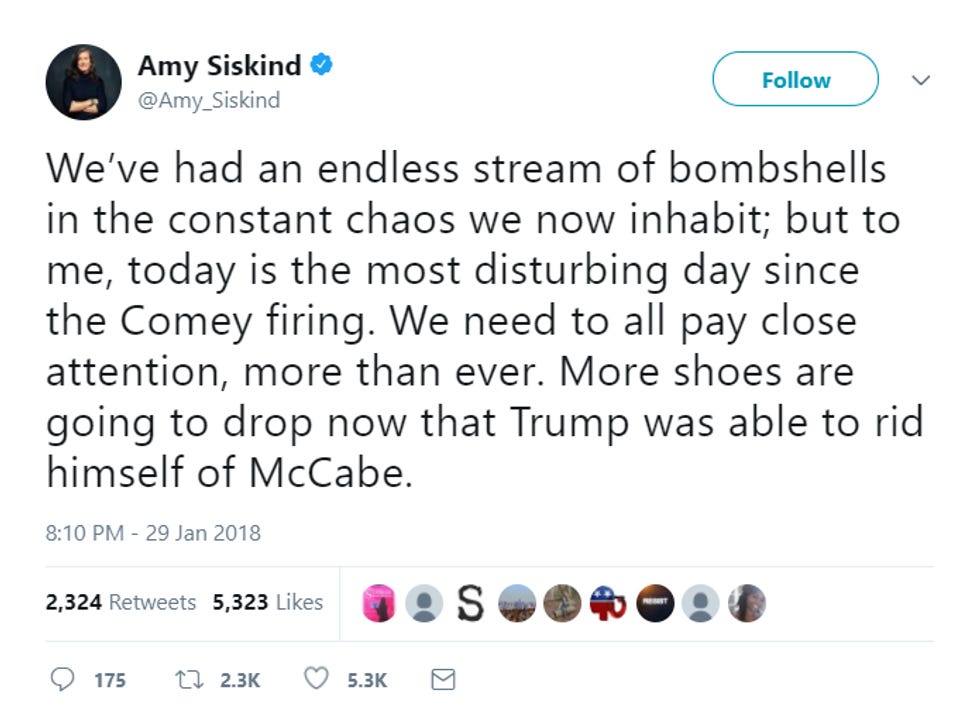By Monday afternoon, shit had already exploded, as Andrew McCabe, the number two guy at the FBI, had been suddenly purged in advance of his already early retirement, apparently to appease the boy tyrant at 1600 Pennsylvania, who gets UPSET when he hears the name "Andrew McCabe," because McCabe had committed sins like "being married to a Democrat" and "failing to jail Trump's political opponent Hillary Clinton in advance."