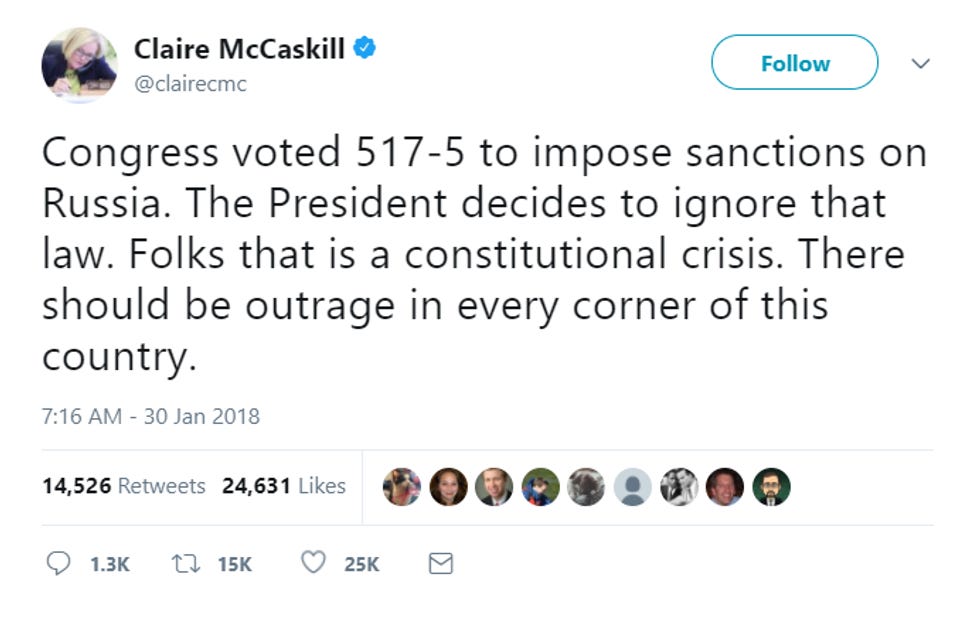 Oh, and did we mention that the Trump regime also too yesterday decided not to implement the Russian sanctions Congress passed by a margin of one million to like three dumb assholes? Didn't see that coming! (Totally saw that coming.)