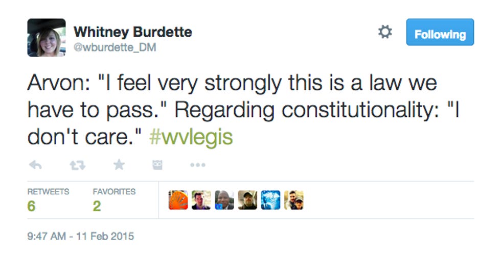 But hey, it's not like the West Virginia legislature has anything better to do right now, so passing a bill that is obviously unconstitutional seems like a terrific use of time and taxpayer money. Maybe once West Virginia has saved all the unborn babies from their heartless raped mothers and the unclear Constitution, the state can move on to some of its lesser problems, like its severe budget gap and its over-regulated coal industry and clean water.