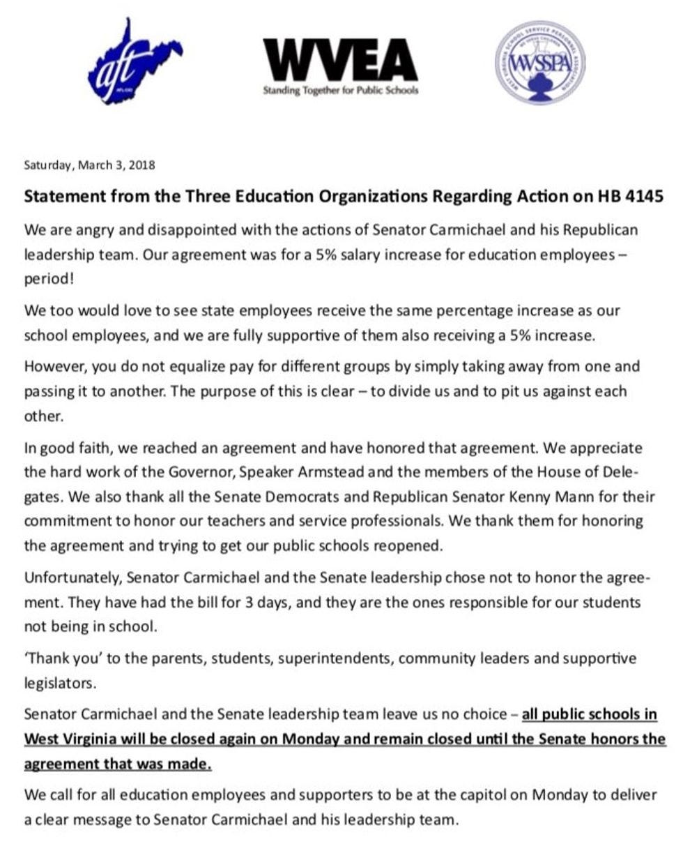 But first, for the sake of low comedy, the Senate on Saturday screwed up and accidentally passed the un-amended House bill with the original deal, then scrambled to undo that little mistake. The West Virginia Education Association, which along with the state arm of the American Federation of Teachers is leading the strike, was astonished: