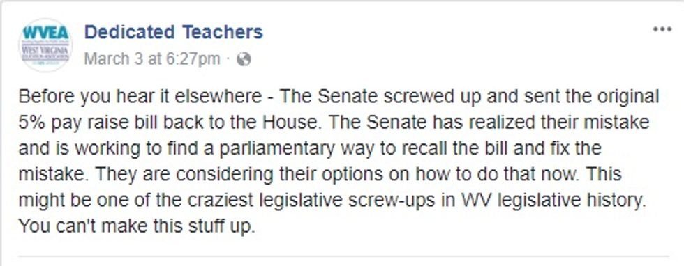 Last week it really looked like striking West Virginia teachers and Justice had reached a deal: Teachers would get a five percent pay raise and a promise to fix state employees' health insurance, the rising costs of which threatened to outstrip the much lower raise Justice had offered before the strike. Teachers and school support staff didn't love it, because West Virginia teacher pay is48th in the nation, but they were willing to go back to work with at least a bit more financial security. The House of Delegates passed the deal (which also raised other state employees' pay by three percent), but in the Senate, Republican leadership decided to dick teachers around some more, because what if the improved revenue forecast Justice had relied on couldn't cover that raise? Also, Senate president Mitch Carmichael seems ideologically committed to screwing over teachers' unions. Do we need to mention he's a Republican?