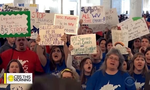 And so all West Virginia schools remain closed today as teachers flood into the statehouse again to make it clear that they would simply like the Legislature to fulfill the governor's promise. You almost get the impression that Mitch Carmichael and other top Republicans in the Senate are far more interested in picking an anti-union fight than in getting kids back to school. But that would be terribly cynical, wouldn't it?