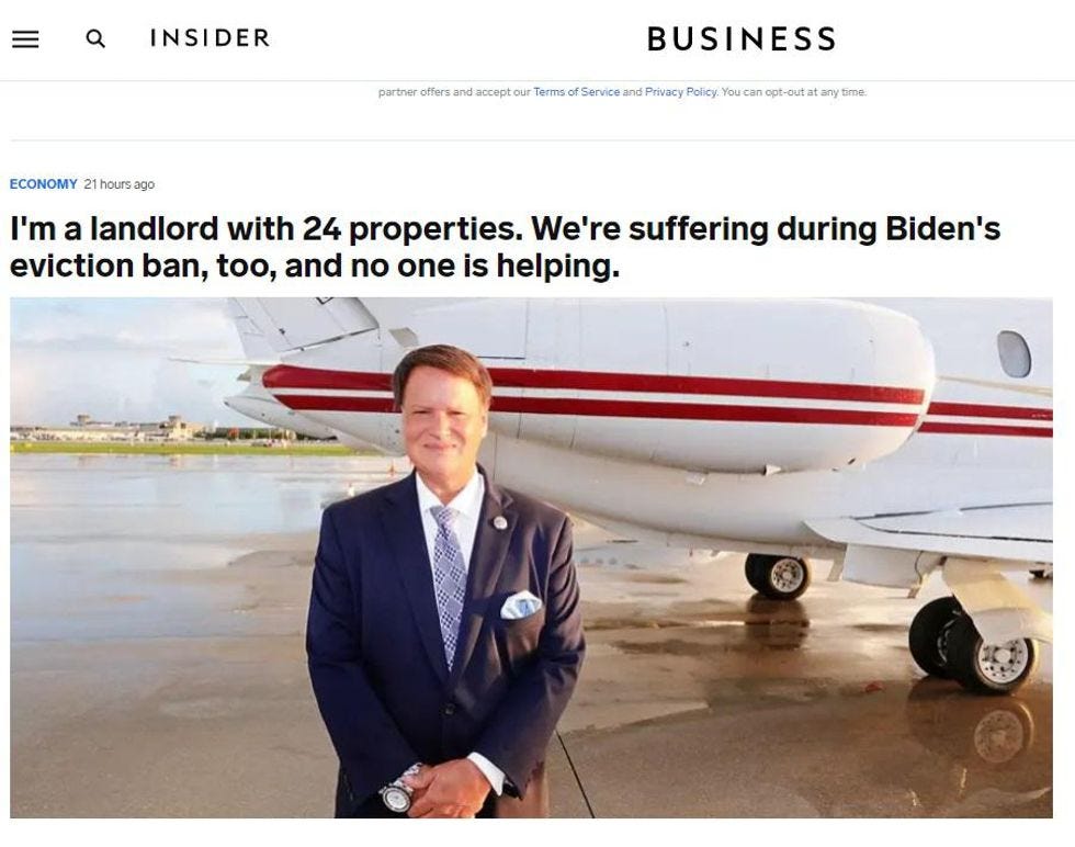 We have to think he might have garnered a bit more sympathy if the "as told to" story of a "suffering" landlord hadn't been illustrated by a photo of said landlord, Julio Gonzalez, CEO of Engineered Tax Services, standing in front of his private jet.