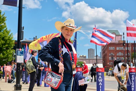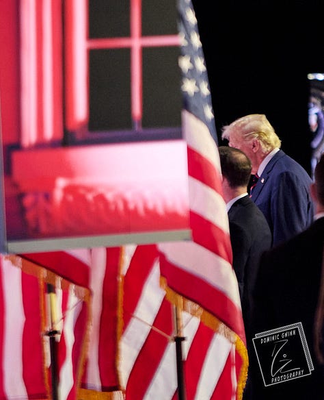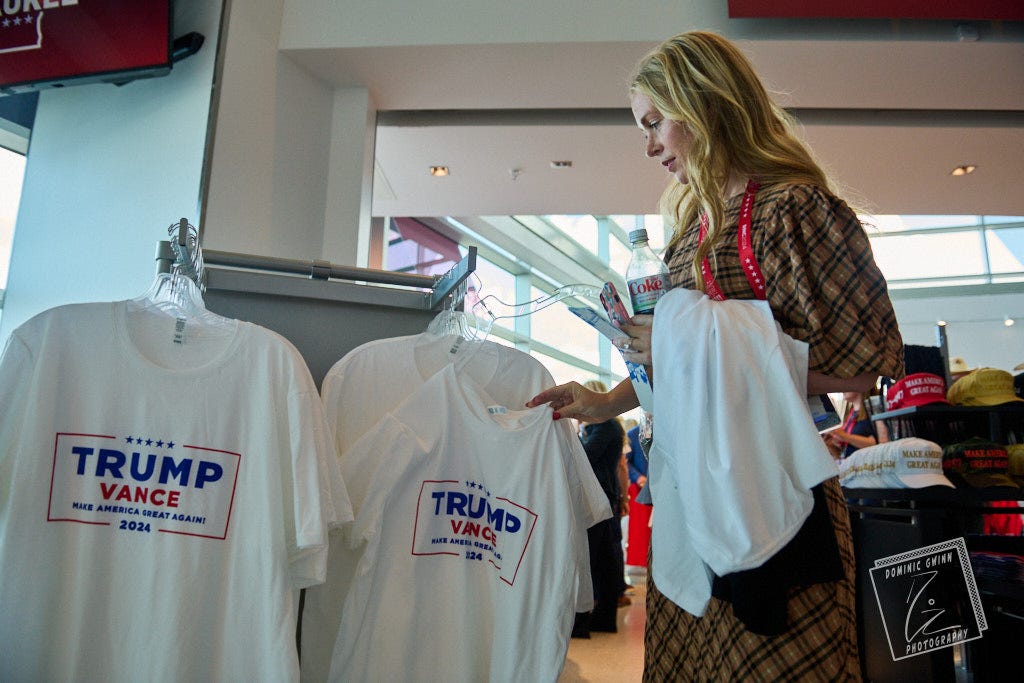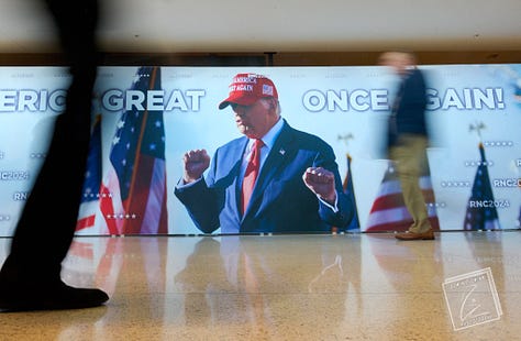1) An RNC volunteer is carted away after an alleged fall. 2) Anti-trans activist Riley Gaines 6) Nixonian hatchet-man, Roger Stone 8) CNN's Harry Enten 9) Donald Trump smiles during a walkthrough of Fiserv Arena