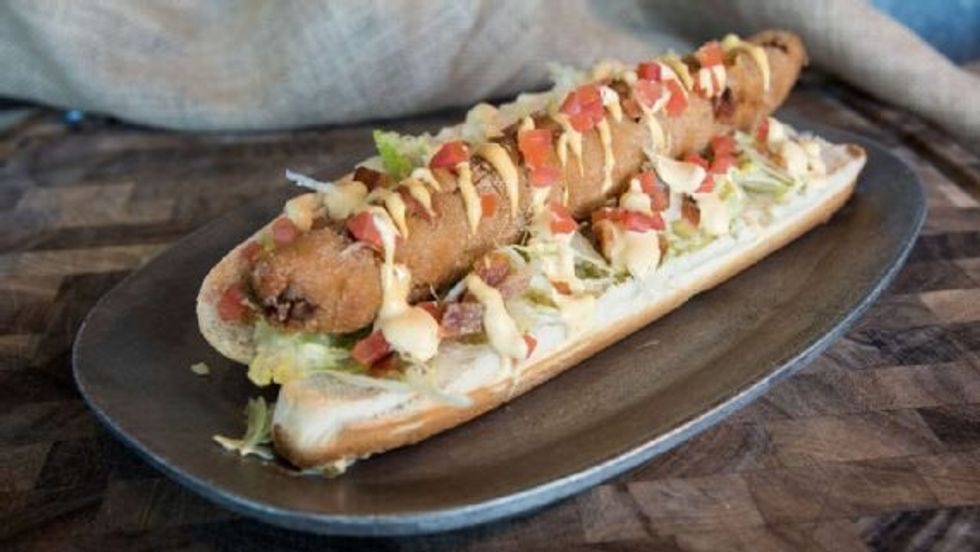 Arizona's baseball team (yes, Arizona has a baseball team) has its own "original" entry to this garbage fire of a competition with the Cheeseburger Dog. It's a hot dog made out of char-grilled hamburger chopped up and blended with bacon, green onion, and cheddar cheese. It is then breaded and deep fried and served on a bun with more bacon (because of course) and "secret sauce."
