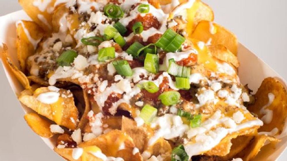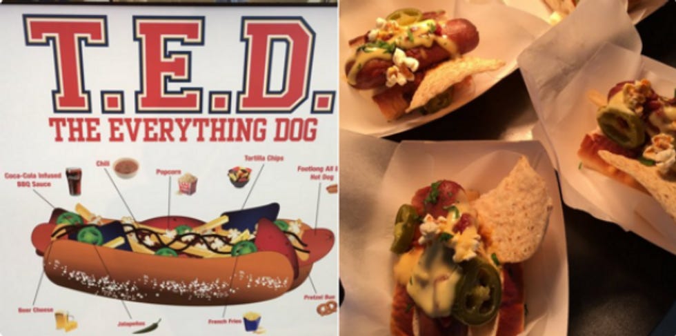 This is called the T.E.D. -- The Everything Dog. We honestly never thought we'd encounter a Ted we instantly loathed more than Ted Cruz, but life is full of surprises. It's allegedly a footlong hot dog (which makes us very confused by the image on the right, which is a foot-long in the same way Donald Trump's hands are normal-sized) layered with fries, chili, nacho chips, beer cheese, jalapenos, and popcorn, topped with coca-cola infused BBQ sauce and served in a pretzel bun. This is less a food dish than what happens when concession workers dare each other to scrape out a stadium trash can and eat whatever they come up with.