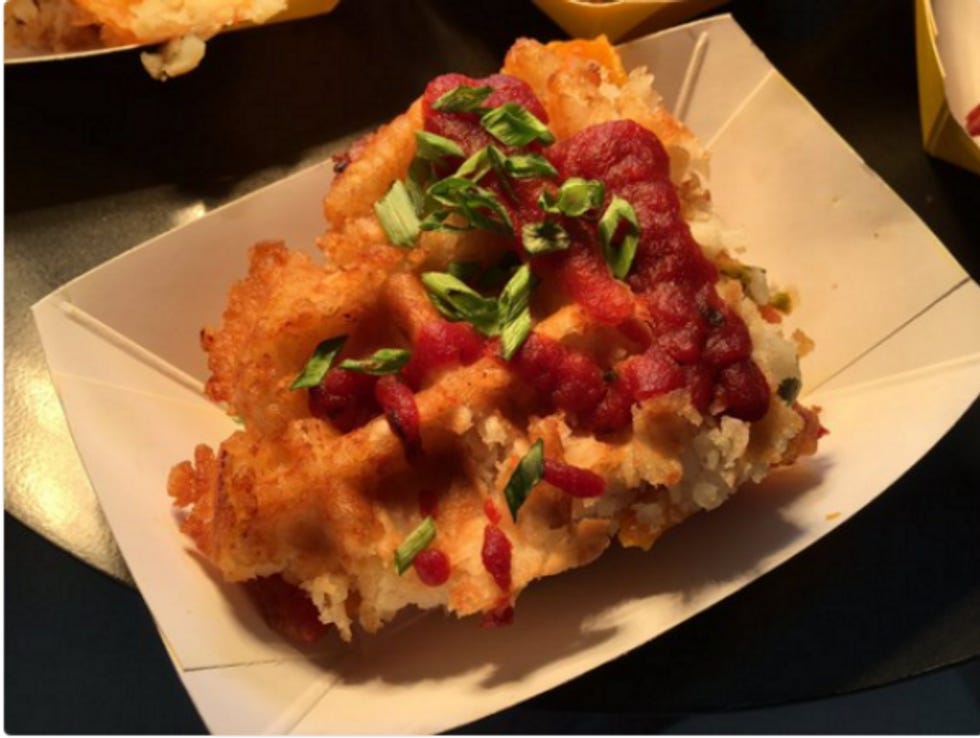 This thing is called the Tater Tot Chop. You read that right: that's not a waffle, it's potatoes crammed into a waffle iron and ultimately topped with bacon, jalapenos, melted cheese, more tator tots (because sure, why not?), and coca-cola-infused ketchup. According to Fox Sports, their taste-tester called it "freaking awesome," probably in the same way hostages reading a list of demands always say they're being well-treated.