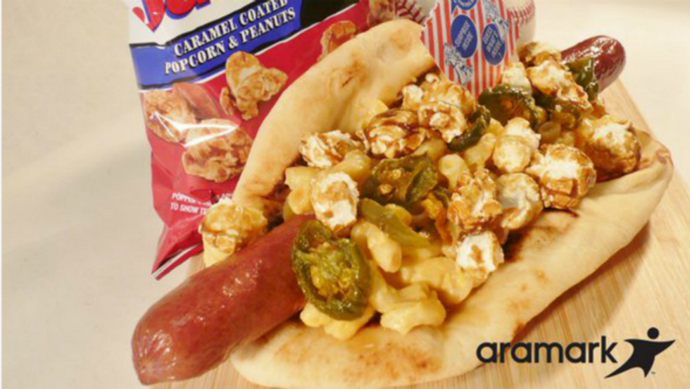 To start us off, the Pittsburgh Pirates have come up with something that is, horrifyingly, exactly what it sounds like: the Cracker Jack & Mac Hot Dog. Yes, that's a hot dog topped with cracker jacks, mac and cheese, salted caramel sauce, and fried jalapenos on naan. First of all, Pirates, stop playing menu mad libs, and second, why would you do that to naan?!