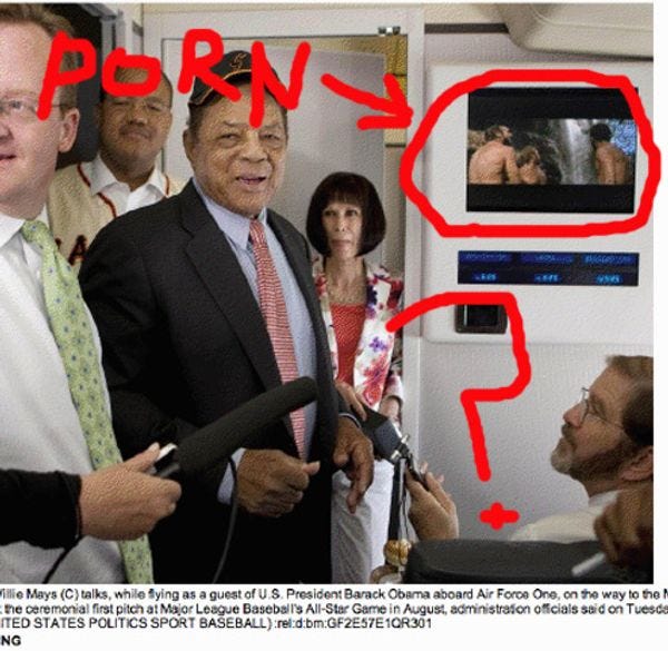 Alert UK journalist "Richard" sent us this Reuters pic, wondering what kind of movie Willie Mays and Robert Gibbs and the sleazy White House press pool enjoyed last night on the flight over to the MLB All-Star game. What doyoupeople think?